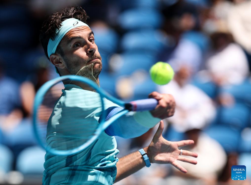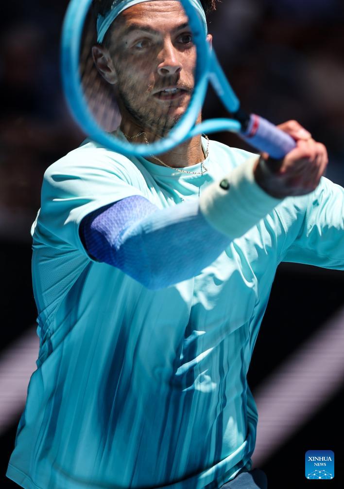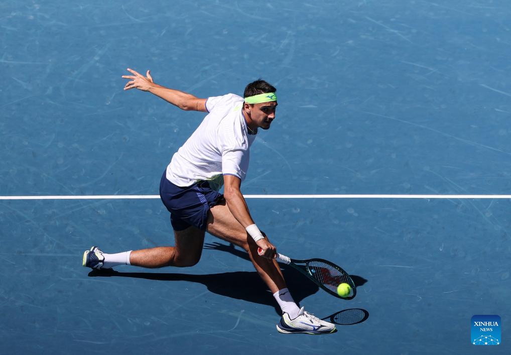 Lorenzo Sonego of Italy hits a return during the men's singles 2nd round match against Lorenzo Musetti of Italy at the Australian Open tennis tournament in Melbourne, Australia, Jan. 22, 2026. (Xinhua/Ma Ping)