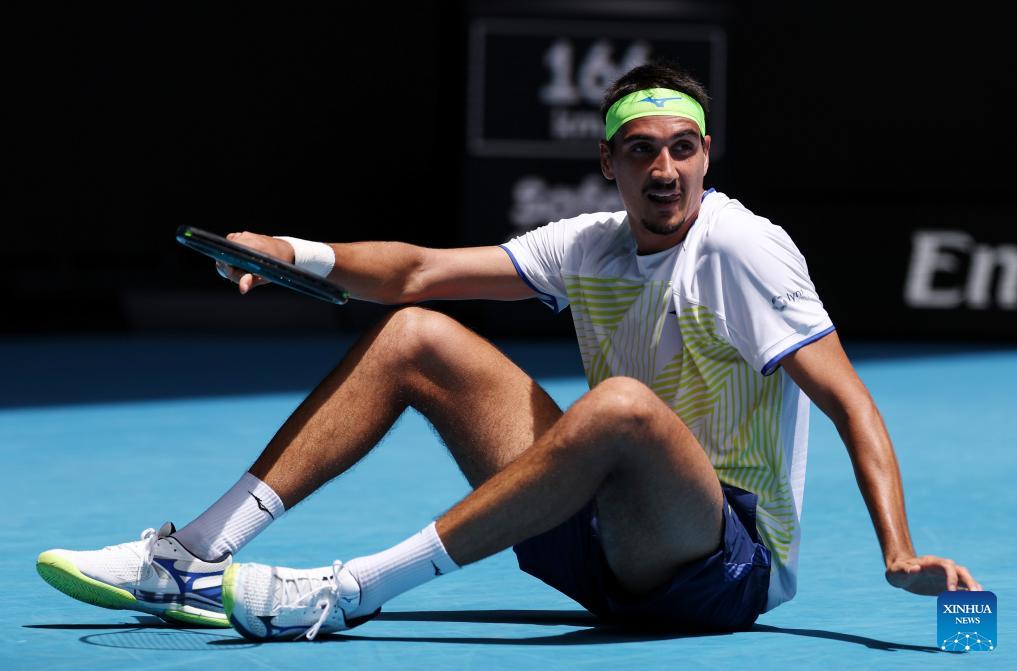 Lorenzo Sonego of Italy reacts during the men's singles 2nd round match against Lorenzo Musetti of Italy at the Australian Open tennis tournament in Melbourne, Australia, Jan. 22, 2026. (Xinhua/Ma Ping)