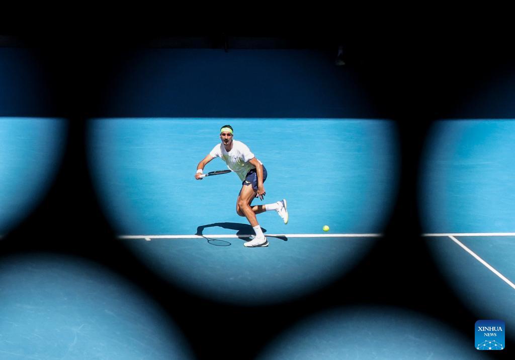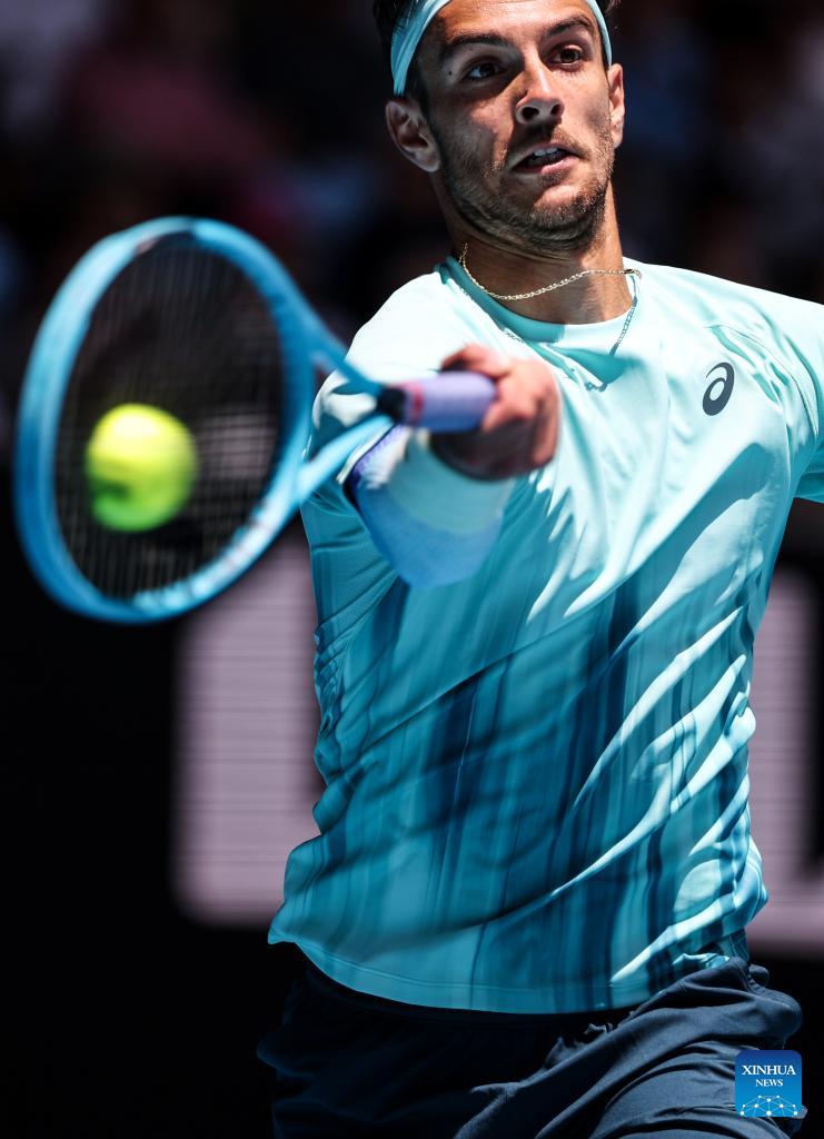 Lorenzo Musetti of Italy hits a return during the men's singles 2nd round match against Lorenzo Sonego of Italy at the Australian Open tennis tournament in Melbourne, Australia, Jan. 22, 2026. (Xinhua/Ma Ping)
