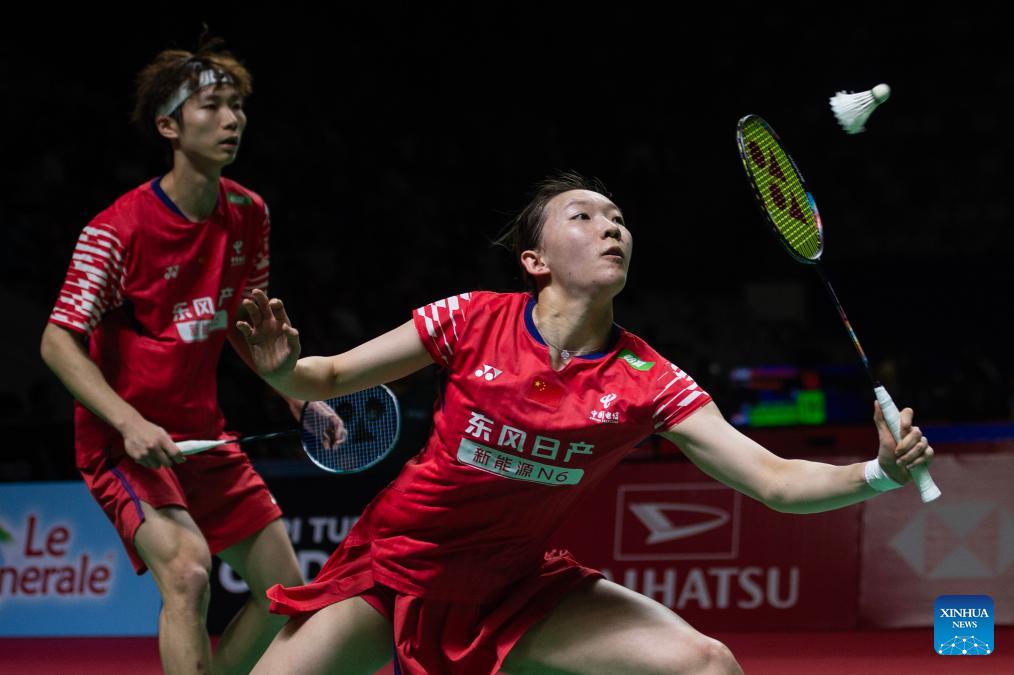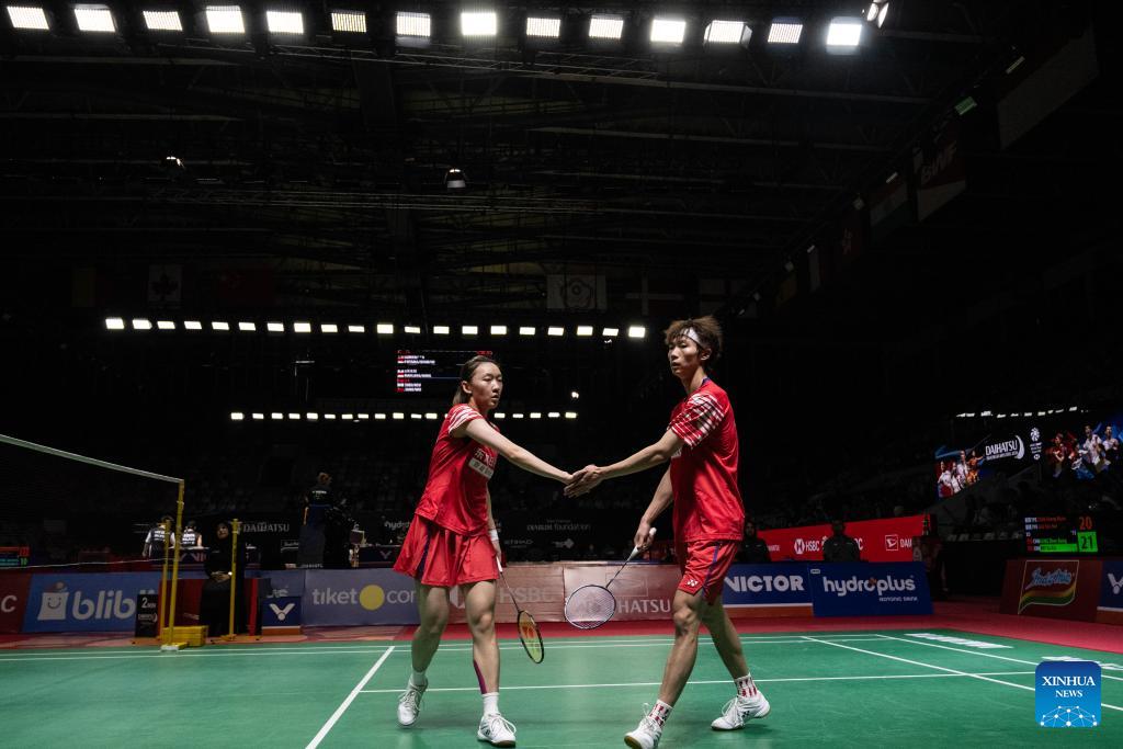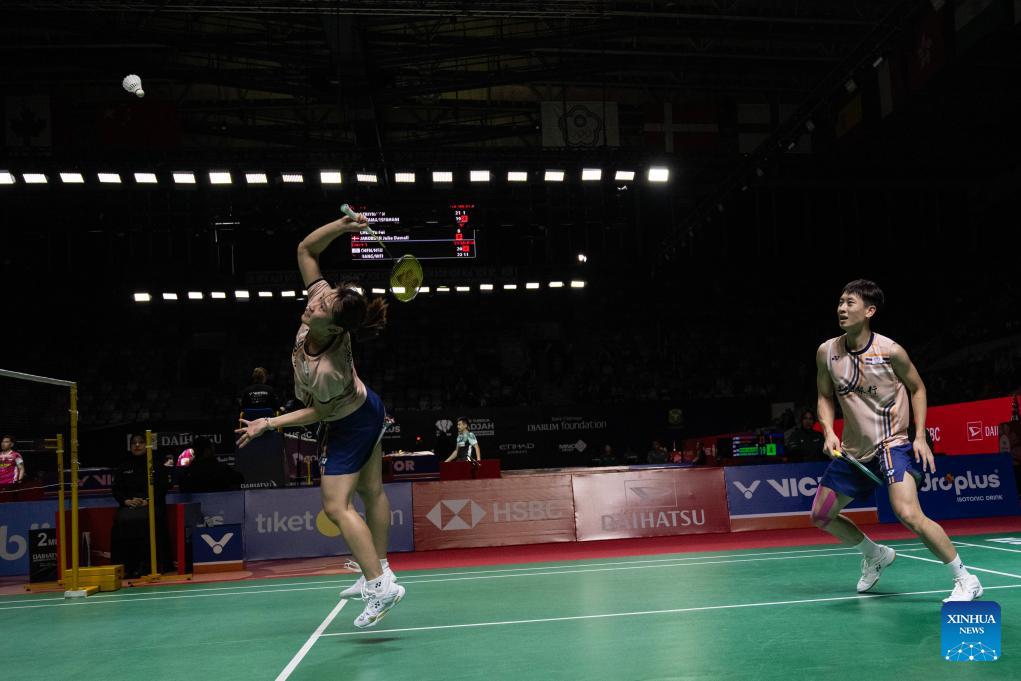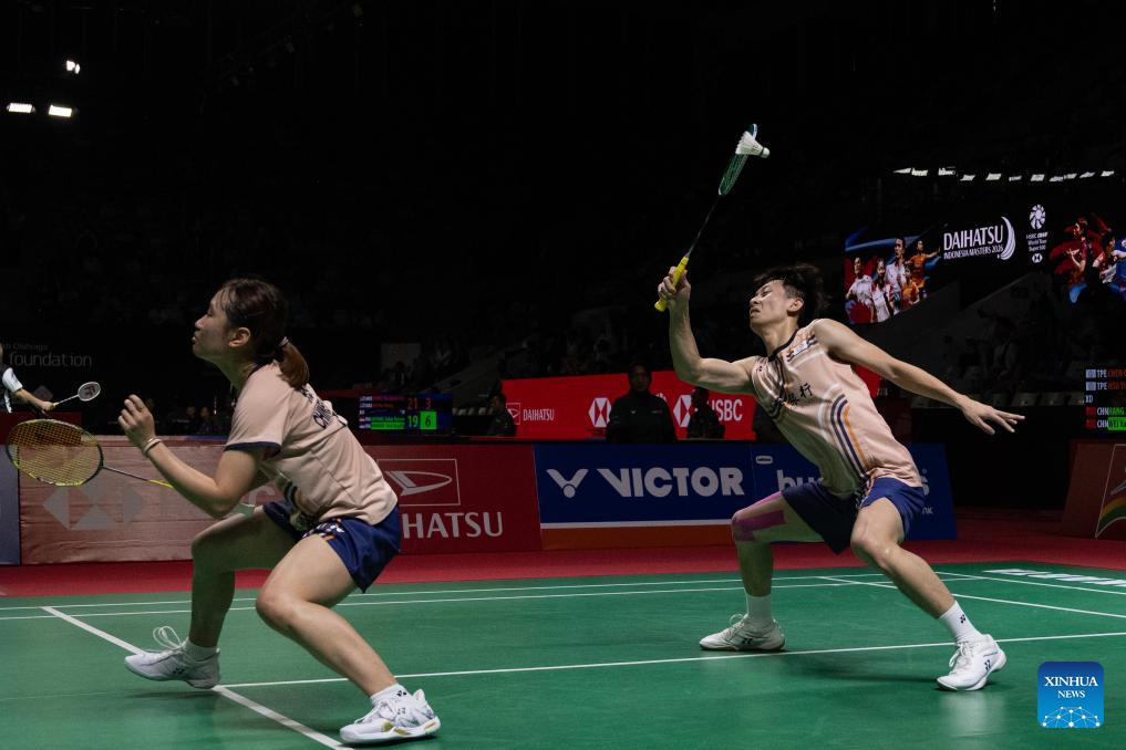 Jiang Zhenbang/Wei Yaxin (R) of China compete during the mixed doubles round of 16 match against Chen Cheng Kuan/Hsu Yin-Hui of Chinese Taipei at the Indonesia Masters 2026 badminton tournament in Jakarta, Indonesia, Jan. 22, 2026. (Xinhua/Veri Sanovri)