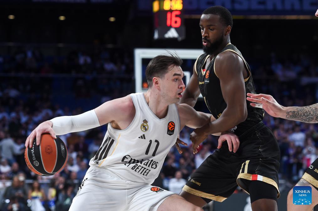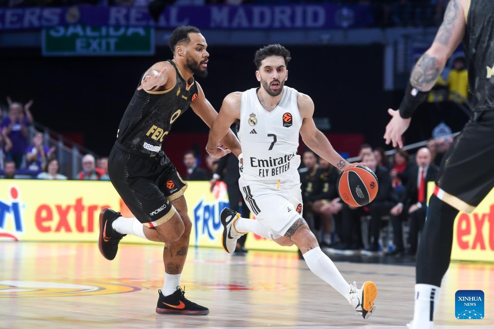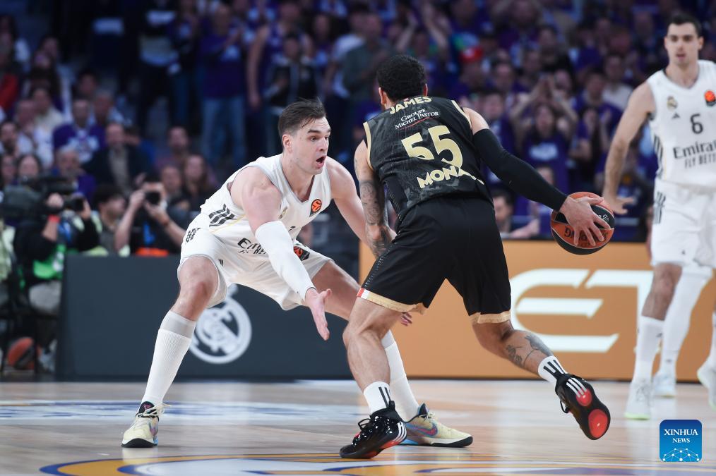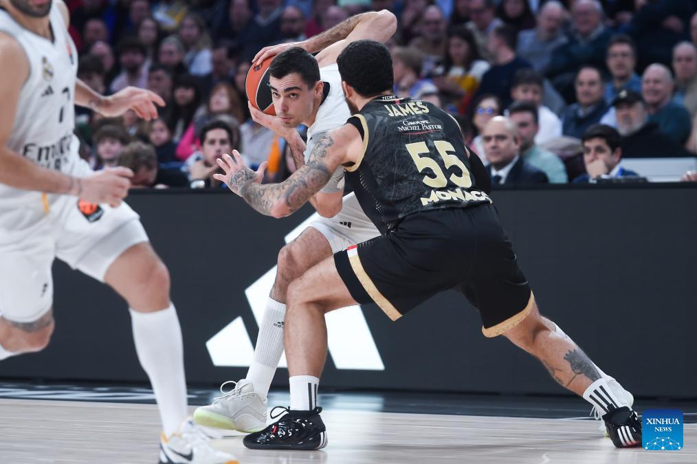 Real Madrid's Mario Hezonja (L) defends AS Monaco's Mike James during the Euroleague basket game between Real Madrid and AS Monaco at Movistar Arena in Madrid, Spain, on Jan. 22, 2026. (Photo by Gustavo Valiente/Xinhua)