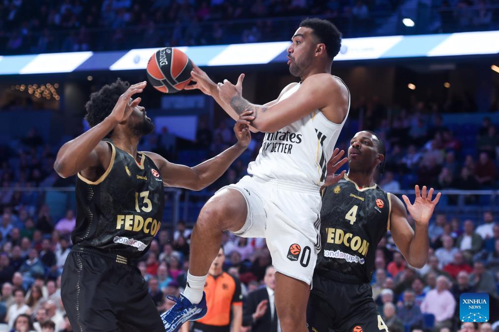 Real Madrid's Trey Lyles (C) passes the ball over AS Monaco's Kevarrius Hayes (L) during the Euroleague basket game between Real Madrid and AS Monaco at Movistar Arena in Madrid, Spain, on Jan. 22, 2026. (Photo by Gustavo Valiente/Xinhua)
