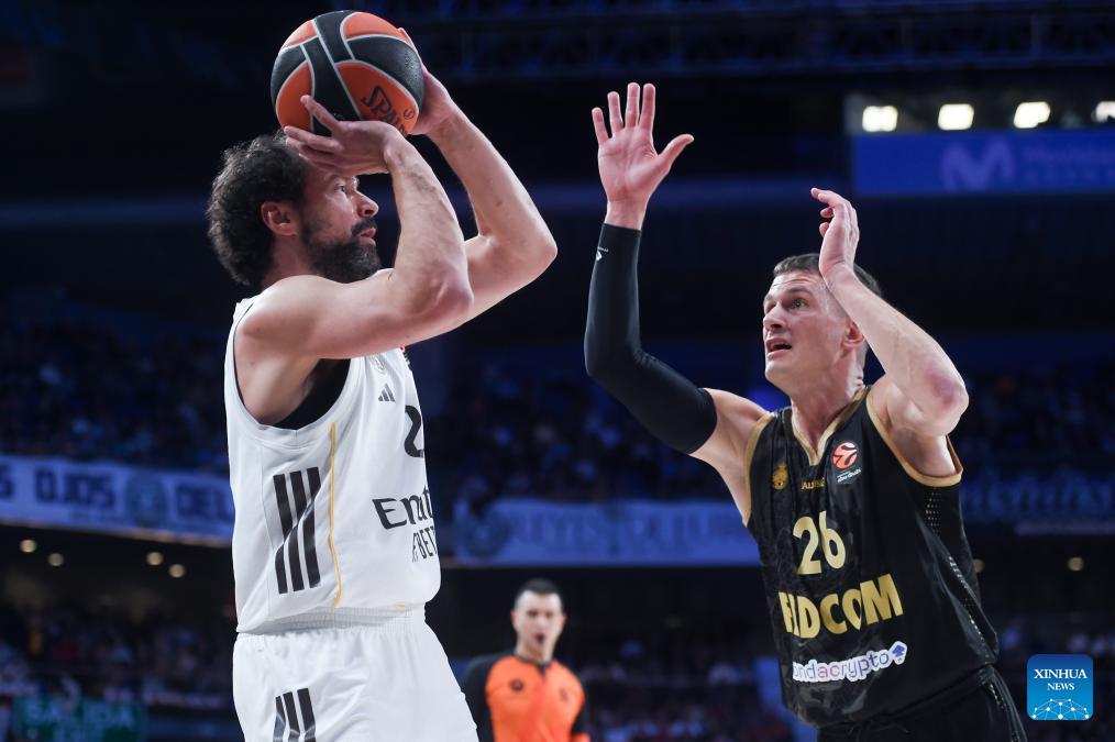 Real Madrid's Sergio Llull (L) shoots against Monaco's Nemanja Nedovic during the Euroleague basket game between Real Madrid and AS Monaco at Movistar Arena in Madrid, Spain, on Jan. 22, 2026. (Photo by Gustavo Valiente/Xinhua)