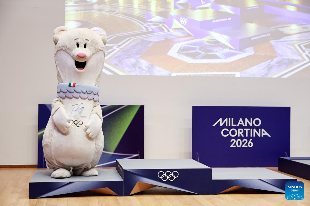 Milano-Cortina 2026 Olympic Games mascot Tina is pictured standing on the newly unveiled podiums for Milano-Cortina 2026 Olympic Games during a ceremony marking 100 days to the opening of the Milano-Cortina 2026 Olympic Winter Games at Palazzo Lombardia in Milan, Italy, Oct. 29, 2025. (Photo: Xinhua)