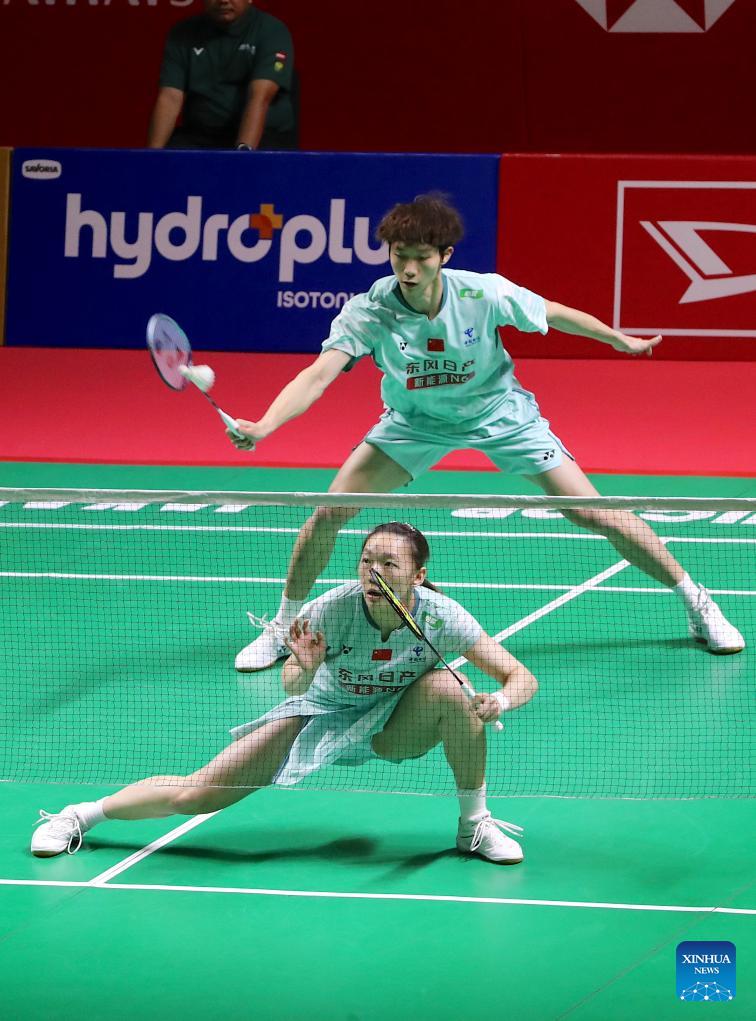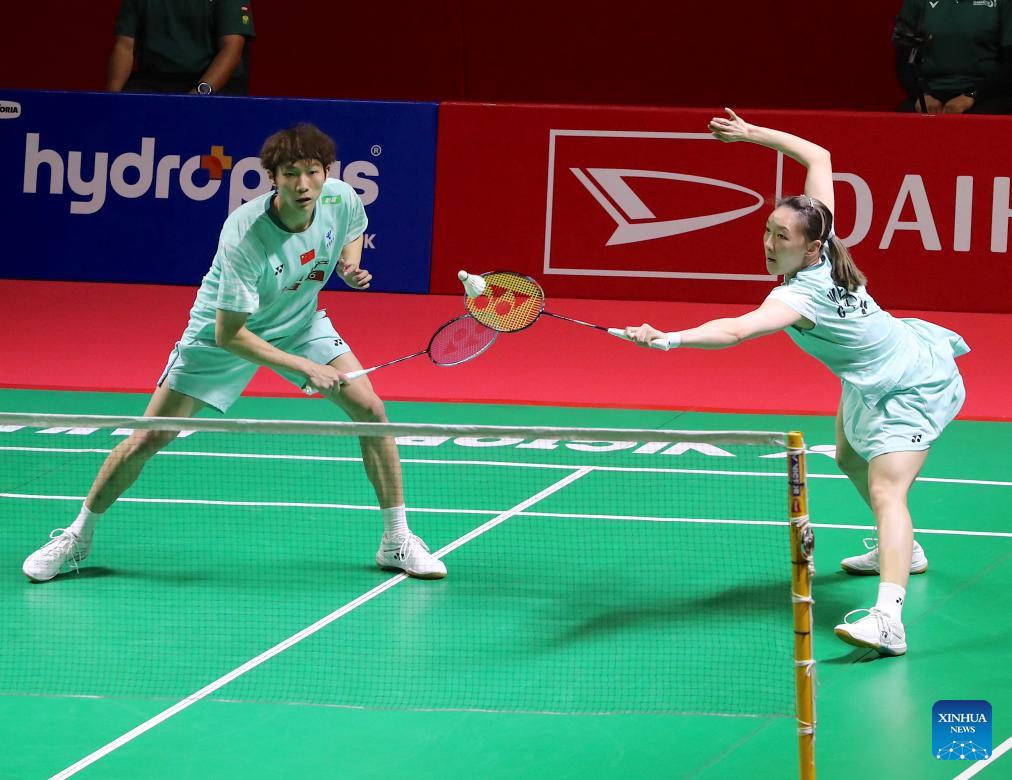 Jiang Zhenbang/Wei Yaxin (R) of China compete during the mixed doubles quarterfinal match between Jiang Zhenbang/Wei Yaxin of China and Adnan Maulana/Indah Cahya Sari Jamil of Indonesia at the Indonesia Masters 2026 badminton tournament in Jakarta, Indonesia, Jan. 23, 2026. (Xinhua/Cen Yunpeng)
