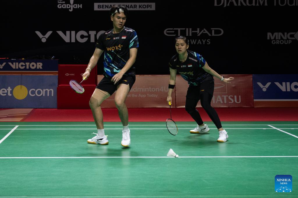 Adnan Maulana (L)/Indah Cahya Sari Jamil of Indonesia compete during the mixed doubles quarterfinal match between Jiang Zhenbang/Wei Yaxin of China and Adnan Maulana/Indah Cahya Sari Jamil of Indonesia at the Indonesia Masters 2026 badminton tournament in Jakarta, Indonesia, Jan. 23, 2026. (Xinhua/Veri Sanovri)