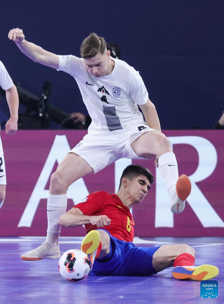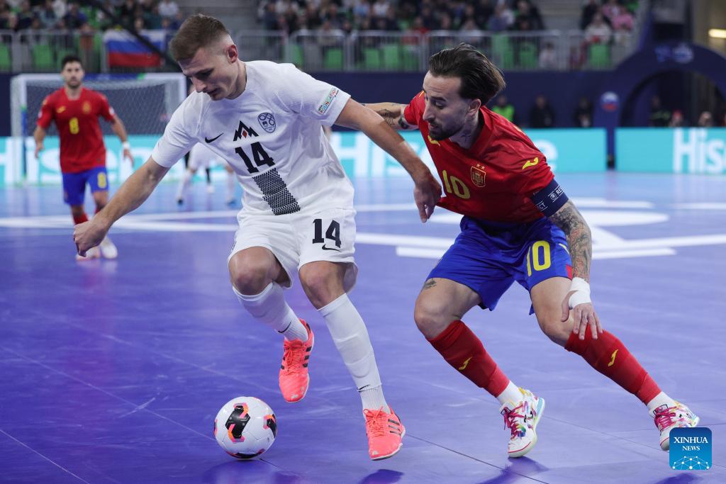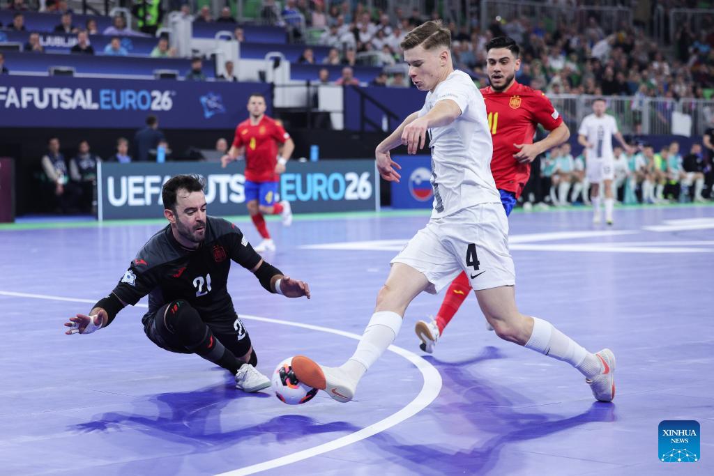 Matej Fidersek (L) of Slovenia vies with Mario Rivillos of Spain during the UEFA Futsal EURO 2026 match between Slovenia and Spain at Arena Stozice, Ljubljana, Slovenia, Jan. 23, 2026. (Photo by Zeljko Stevanic/Xinhua)