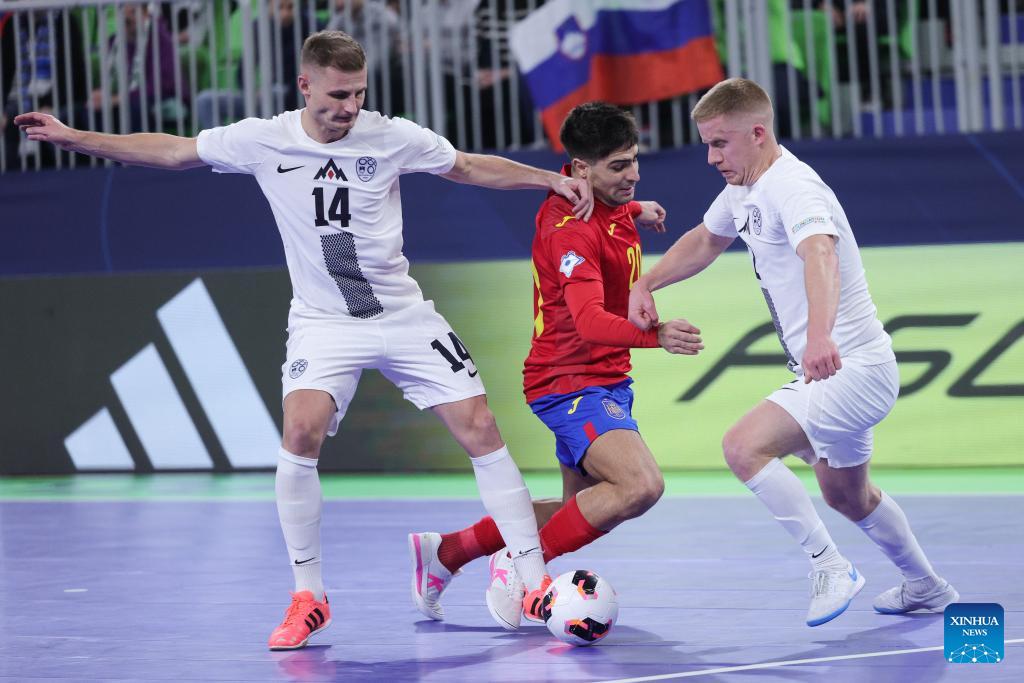 David Novoa of Spain (C) competes against Matej Fidersek (L) and Teo Turk of Slovenia during the UEFA Futsal EURO 2026 match between Slovenia and Spain at Arena Stozice, Ljubljana, Slovenia, Jan. 23, 2026. (Photo by Zeljko Stevanic/Xinhua)