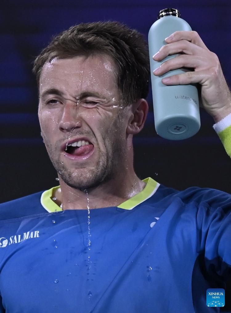 Casper Ruud cools down during the men's singles 3rd round match between Marin Cilic of Croatia and Casper Ruud of Norway at the Australian Open tennis tournament in Melbourne, Australia, Jan. 24, 2026. (Photo by Wang Shen/Xinhua)