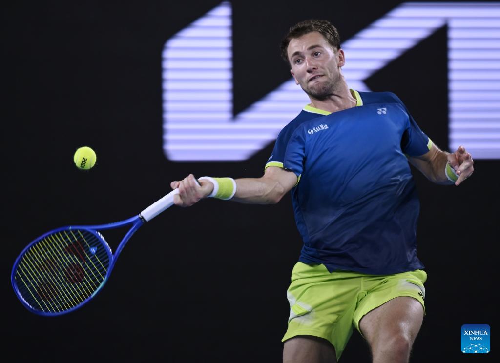 Casper Ruud hits a return during the men's singles 3rd round match between Marin Cilic of Croatia and Casper Ruud of Norway at the Australian Open tennis tournament in Melbourne, Australia, Jan. 24, 2026. (Photo by Wang Shen/Xinhua)