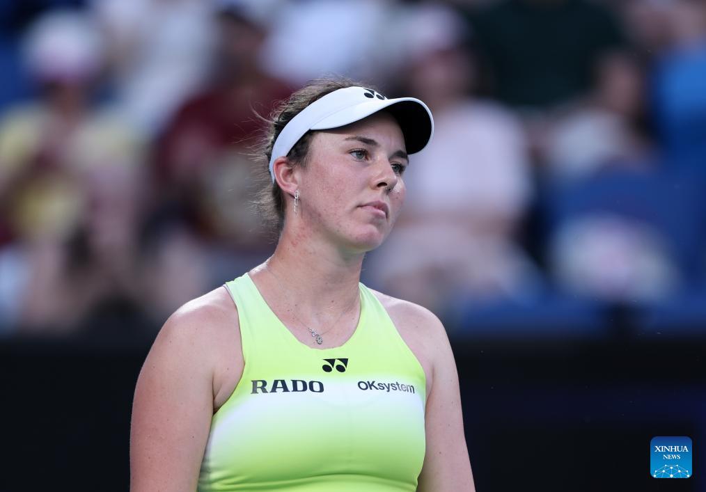 Linda Noskova reacts during the women's singles 3rd round match between Wang Xinyu of China and Linda Noskova of the Czech Republic at the Australian Open 2026 tennis tournament in Melbourne, Australia, Jan. 24, 2026. (Xinhua/Ma Ping)