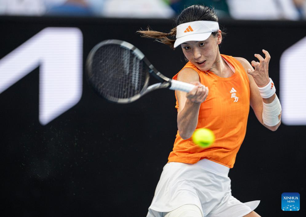 Wang Xinyu hits a return during the women's singles 3rd round match between Wang Xinyu of China and Linda Noskova of the Czech Republic at the Australian Open 2026 tennis tournament in Melbourne, Australia, Jan. 24, 2026. (Xinhua/Ma Ping)
