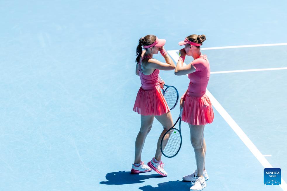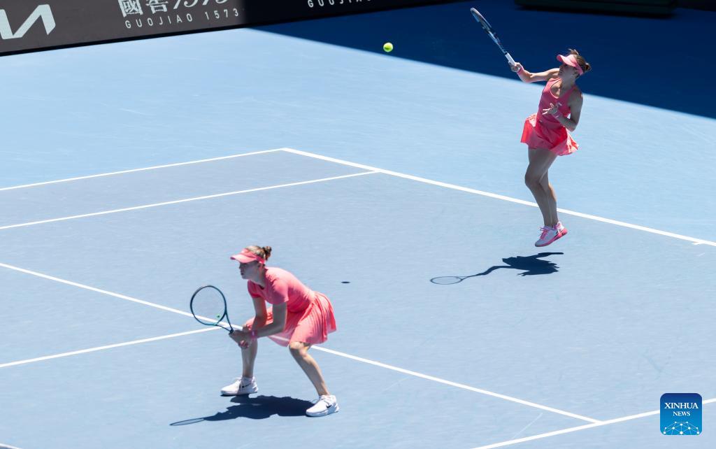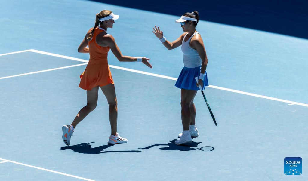 Kimberley Birrell (R)/Talia Gibson compete during the women's doubles 3rd round match between Guo Hanyu (China)/Kristina Mladenovic (France) and Kimberley Birrell/Talia Gibson of Australia at the Australian Open tennis tournament in Melbourne, Australia, Jan. 26, 2026. (Photo by Hu Jingchen/Xinhua)