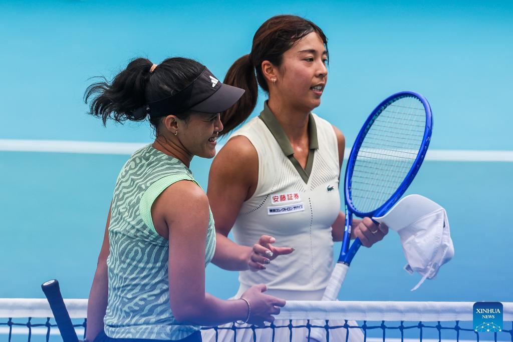 Hontama Mai (R) of Japan greets Elizabeth Abarquez of the Philippines during the women's singles round of 32 match between Hontama Mai of Japan and Elizabeth Abarquez of the Philippines at the WTA Philippine Women's Open in Manila, the Philippines, Jan. 26, 2026. (Xinhua/Rouelle Umali)
