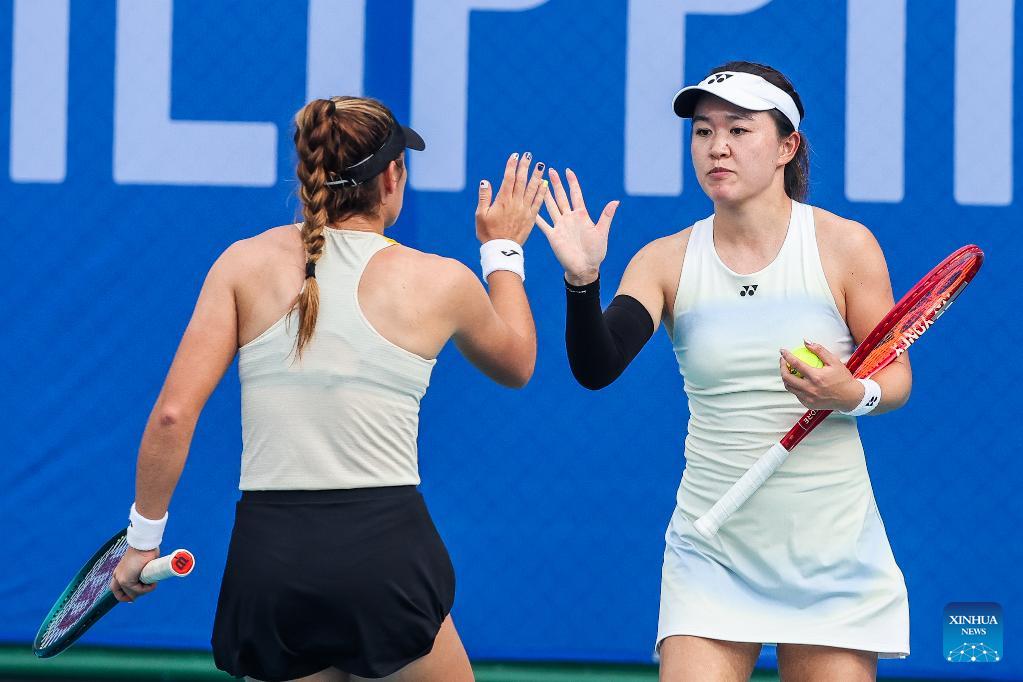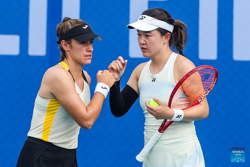 Zhu Lin (R)/Solana Sierra celebrate after scoring a point during the women's doubles round of 16 match between Cho I-Hsuan/Cho Yi-Tsen of Chinese Taipei and Solana Sierra (Argentina)/Zhu Lin (China) at the WTA Philippine Women's Open in Manila, the Philippines, Jan. 26, 2026. (Xinhua/Rouelle Umali)
