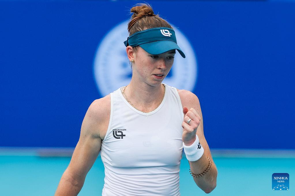 Simona Waltert celebrates scoring during the women's singles round of 32 match between Lanlana Tararudee of Thailand and Simona Waltert of Switzerland at the WTA Philippine Women's Open in Manila, the Philippines, Jan. 26, 2026. (Xinhua/Rouelle Umali)