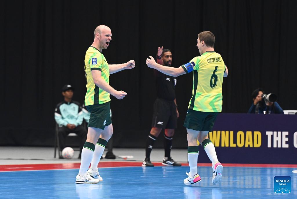 Grant Lynch (L) of Australia celebrates after scoring during the group C match between Japan and Australia at the AFC Futsal Asian Cup 2026 in Jakarta, Indonesia, Jan. 28, 2026. (Xinhua/Zulkarnain)