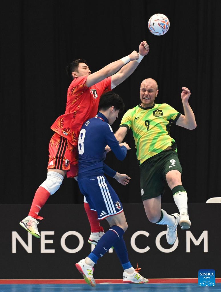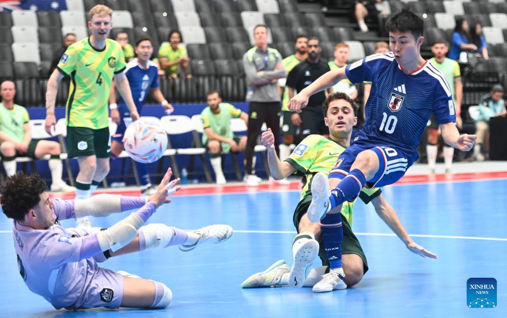 Uchida Shunta (R) of Japan shoots during the group C match between Japan and Australia at the AFC Futsal Asian Cup 2026 in Jakarta, Indonesia, Jan. 28, 2026. (Xinhua/Zulkarnain)