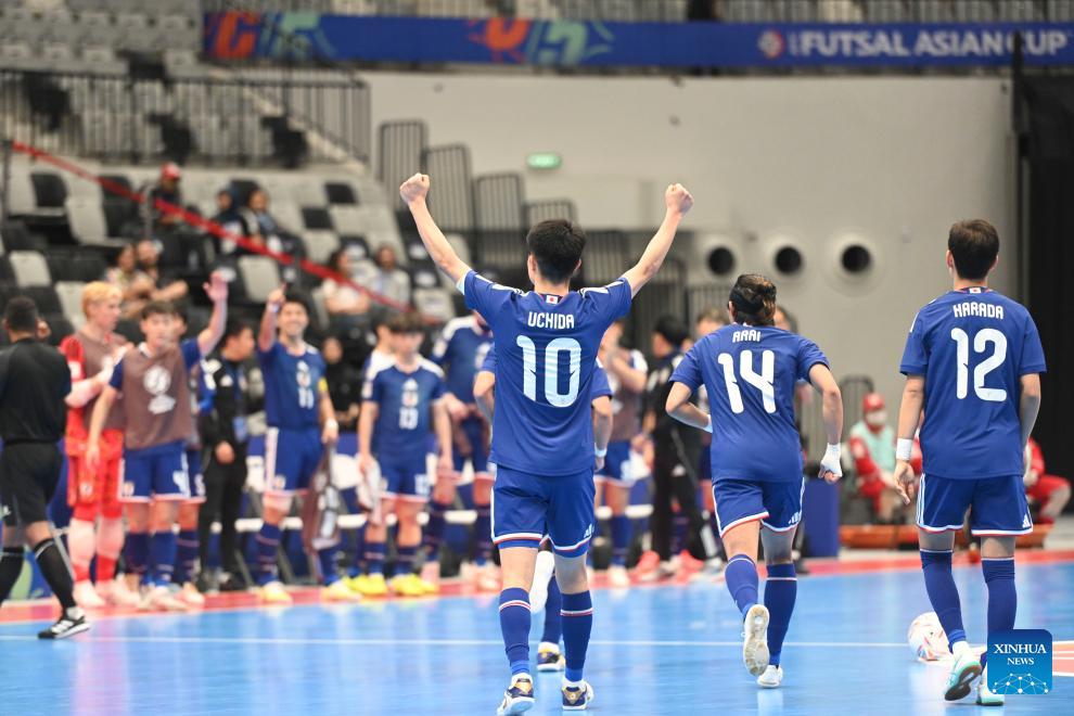Uchida Shunta (L) of Japan celebrates during the group C match between Japan and Australia at the AFC Futsal Asian Cup 2026 in Jakarta, Indonesia, Jan. 28, 2026. (Xinhua/Zulkarnain)