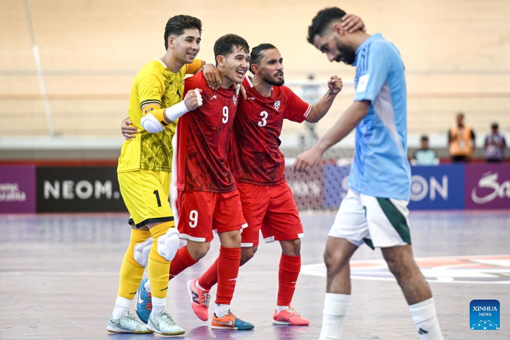 Players of Afghanistan celebrate after scoring during the group D match between Afghanistan and Saudi Arabia at the AFC Futsal Asian Cup 2026 in Jakarta, Indonesia, Jan. 28, 2026. (Xinhua/Agung Kuncahya B.)