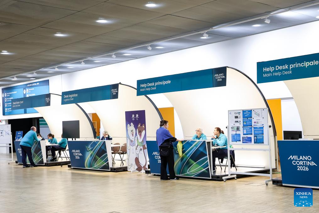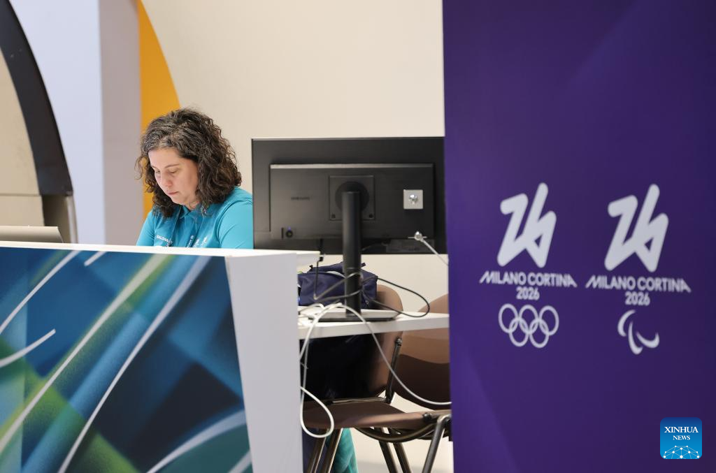 A staff works at a help desk in the main media center (MMC) of the Milan-Cortina 2026 Olympic Winter Games in Milan, Italy, Jan. 28, 2026. (Xinhua/Du Xiaoyi)