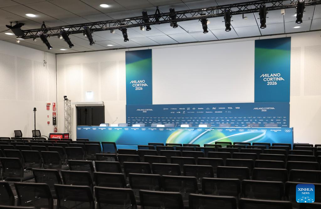 Photo taken on Jan. 28, 2026 shows a view of the press conference room at the main media center (MMC) of the Milan-Cortina 2026 Olympic Winter Games in Milan, Italy. (Xinhua/Hu Xingyu)