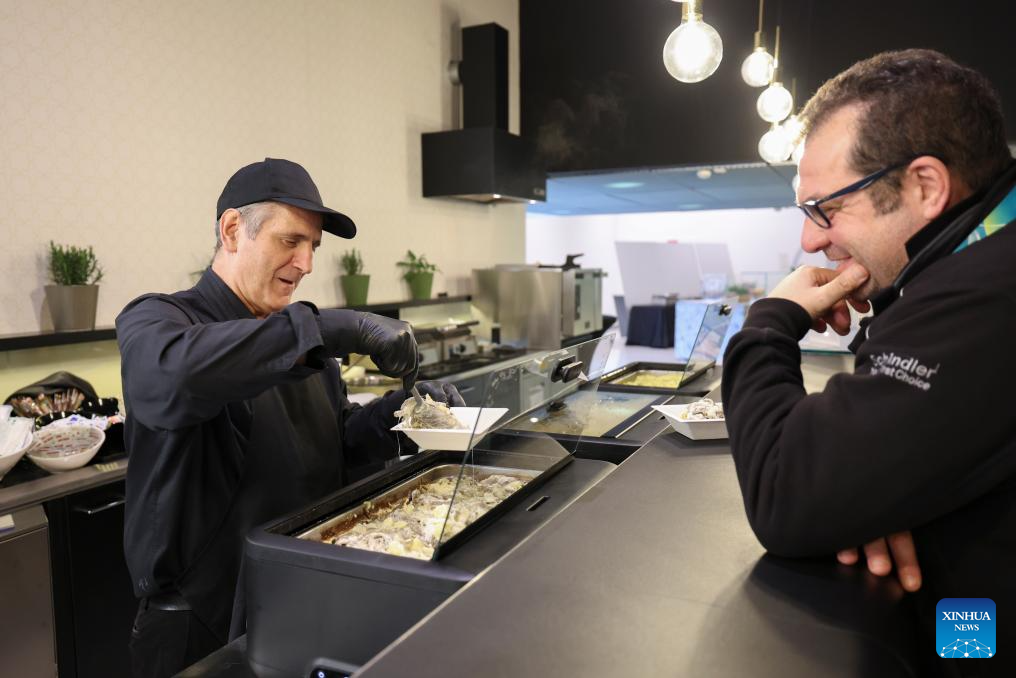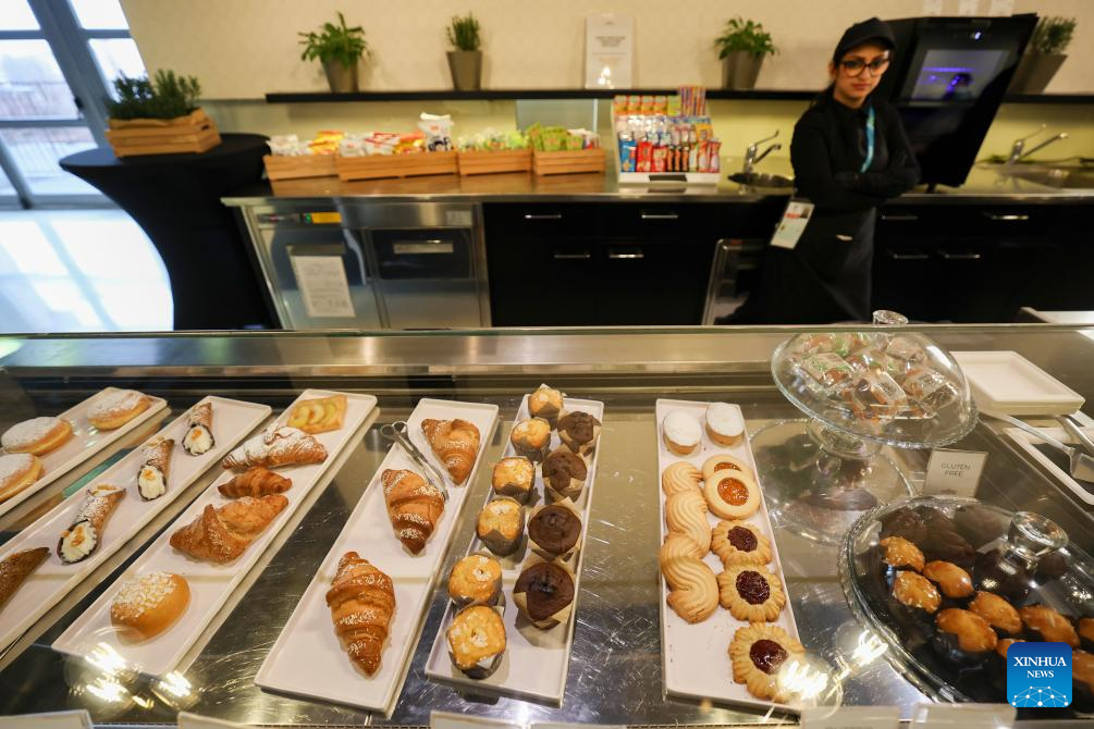 A staff member (L) provides food at the restaurant of the main media center (MMC) of the Milan-Cortina 2026 Olympic Winter Games in Milan, Italy, Jan. 28, 2026. (Xinhua/Hu Xingyu)