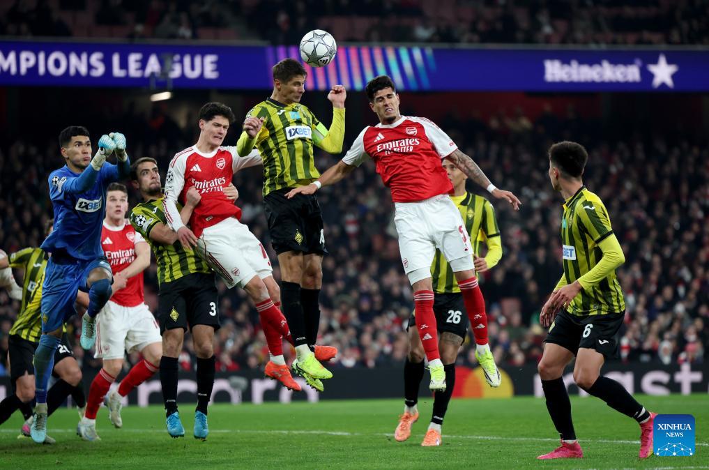 Arsenal's Kai Havertz (top L) scores his goal during the UEFA Champions League football match between Arsenal and Kairat Almaty in London, Britain, Jan. 28, 2026. (Xinhua/Li Ying)