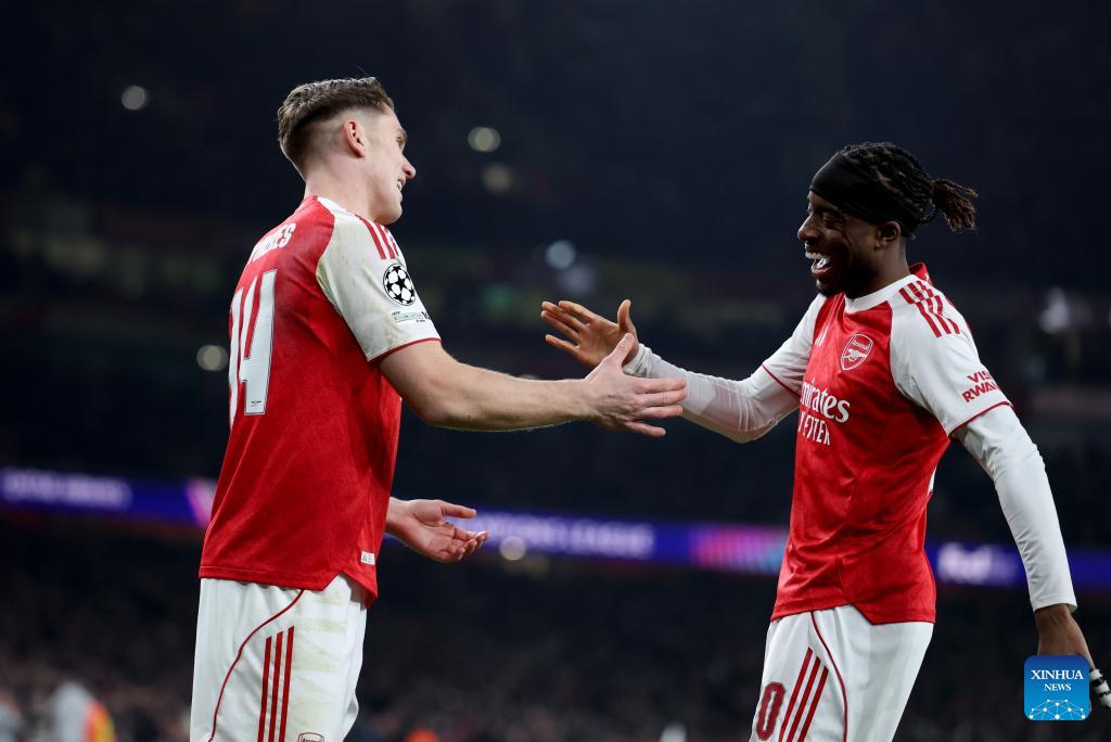 Arsenal's Noni Madueke (L) vies for the ball during the UEFA Champions League football match between Arsenal and Kairat Almaty in London, Britain, Jan. 28, 2026. (Xinhua/Li Ying)