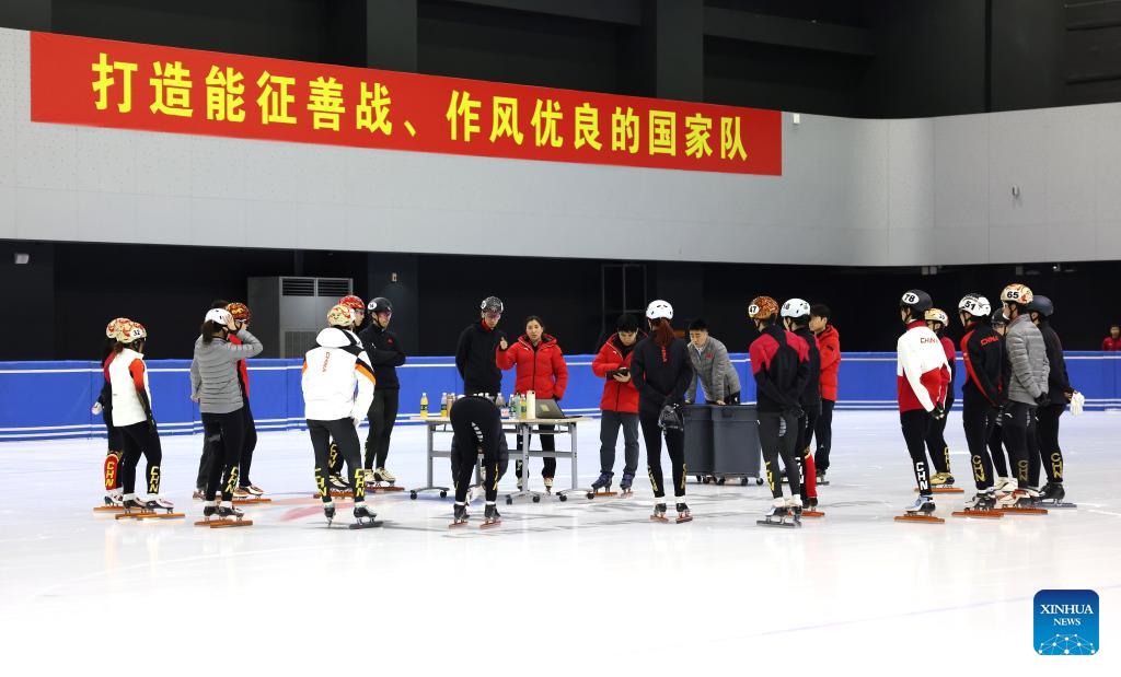 Skaters of China's short track speed skating team take part in a training session ahead of the upcoming Milan-Cortina 2026 Winter Olympics in Beijing, China, Jan. 29, 2026. (Xinhua/Li Ming)