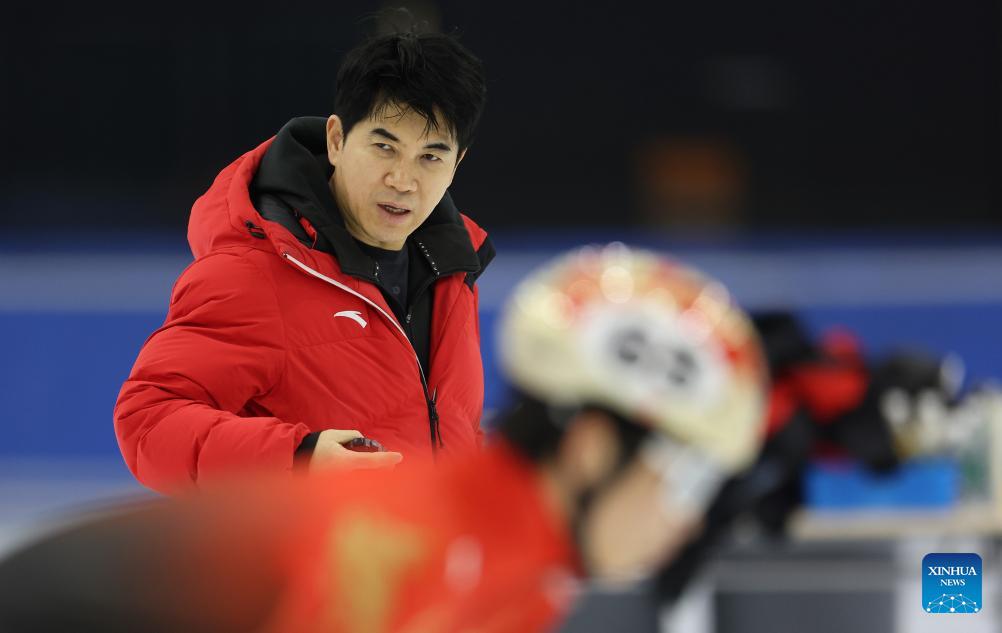 Chun Jaesu, coach of China's short track speed skating team, instructs skaters during a training session ahead of the upcoming Milan-Cortina 2026 Winter Olympics in Beijing, China, Jan. 29, 2026. (Xinhua/Li Ming)