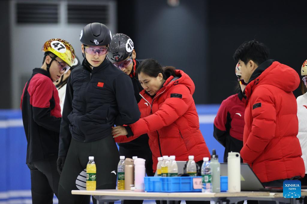 Zhang Jing (C), head coach of China's short track speed skating team, instructs skaters during a training session ahead of the upcoming Milan-Cortina 2026 Winter Olympics in Beijing, China, Jan. 29, 2026. (Xinhua/Zhang Chen)