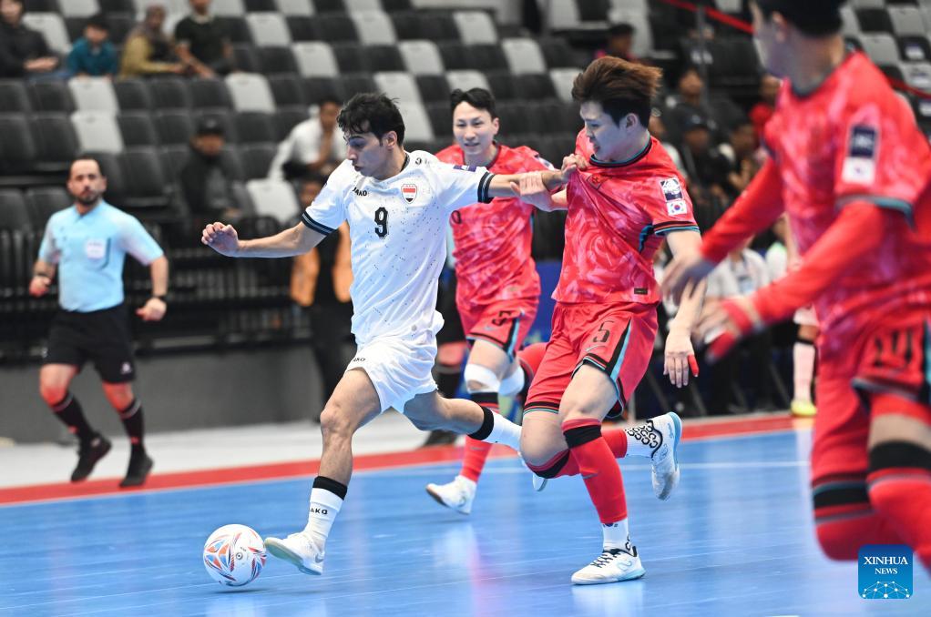 Eom Jiyong (2nd R) of South Korea vies with Salim Kadhim Al-Darraji (L) of Iraq during the group A match between South Korea and Iraq at the AFC Futsal Asian Cup 2026 in Jakarta, Indonesia, Jan. 29, 2026. (Xinhua/Zulkarnain)