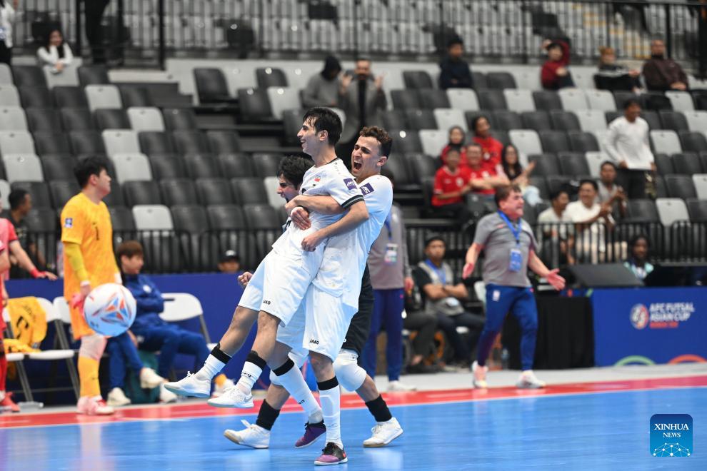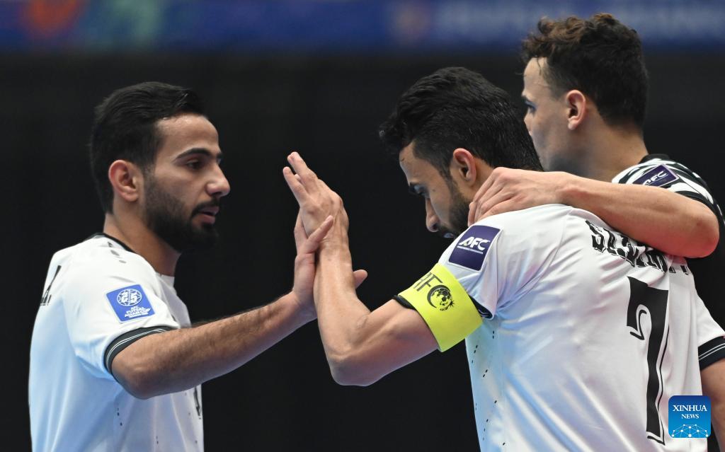 Salim Faisal Al-Husaynat (C) of Iraq celebrates his goal during the group A match between South Korea and Iraq at the AFC Futsal Asian Cup 2026 in Jakarta, Indonesia, Jan. 29, 2026. (Xinhua/Zulkarnain)