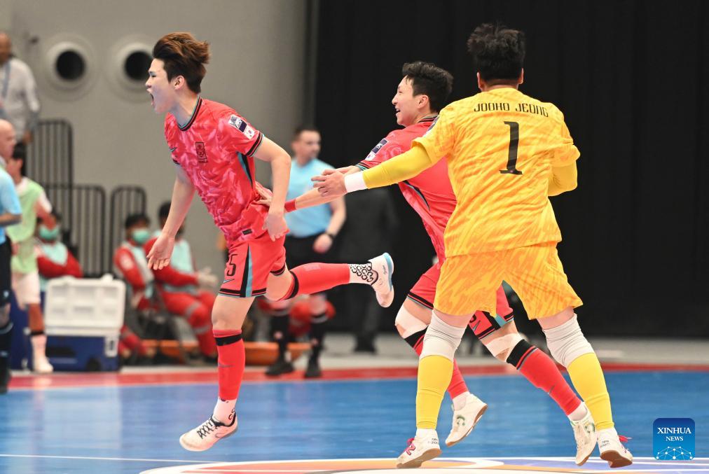 Eom Jiyong (L) of South Korea celebrates his goal during the group A match between South Korea and Iraq at the AFC Futsal Asian Cup 2026 in Jakarta, Indonesia, Jan. 29, 2026. (Xinhua/Zulkarnain)
