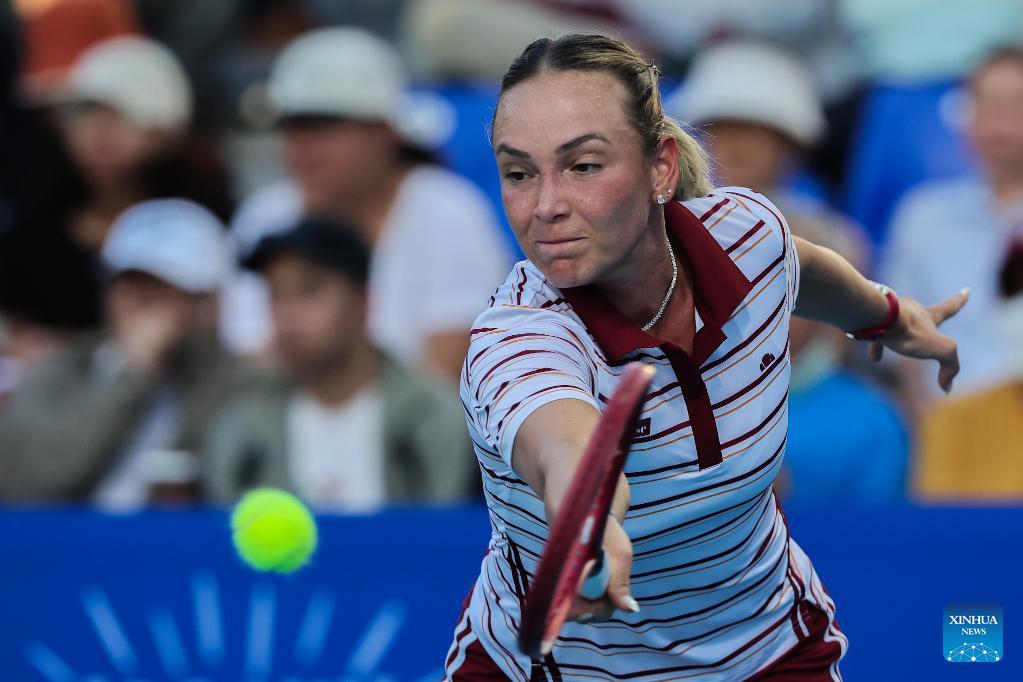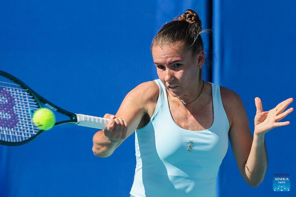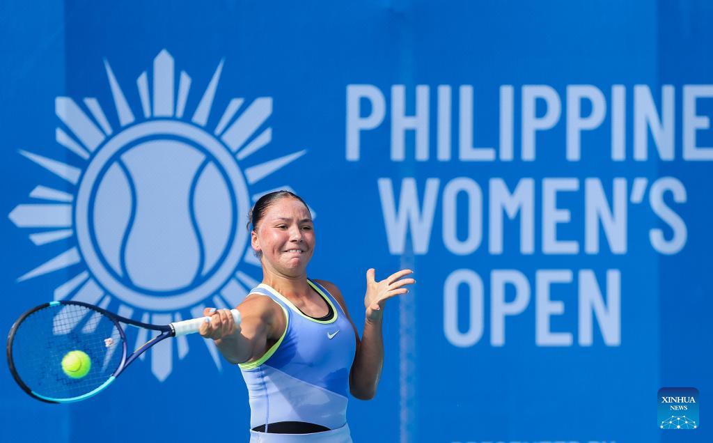 Tatiana Prozorova hits a return during the women's singles quarterfinal match between Tatiana Prozorova of Russia and Sofia Costoulas of Belgium at the WTA Philippine Women's Open in Manila, the Philippines, Jan. 29, 2026. (Xinhua/Rouelle Umali)