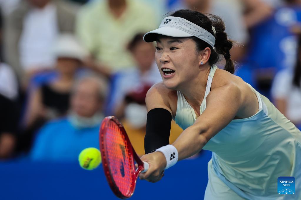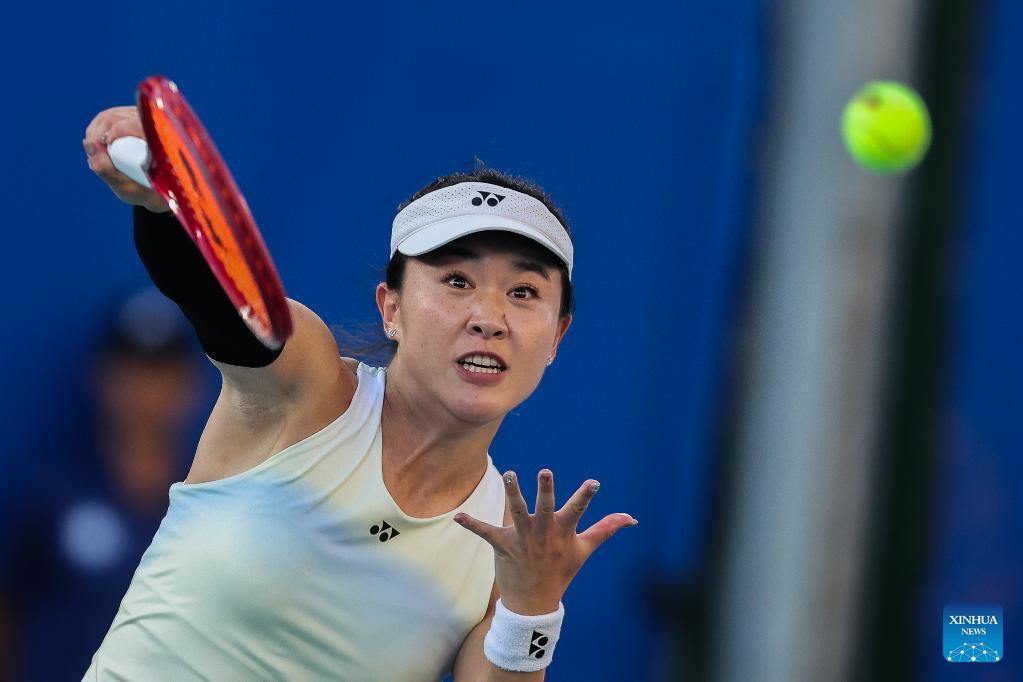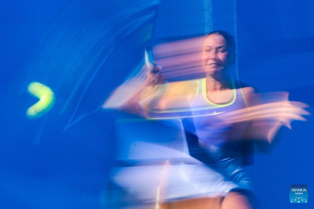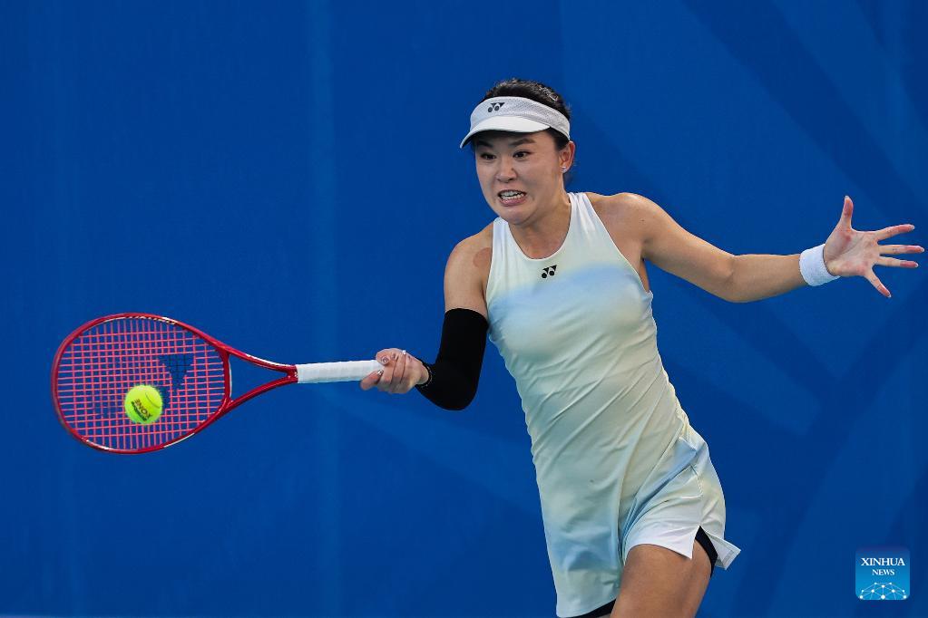 Zhu Lin competes during the women's singles quarterfinal match between Donna Vekic of Croatia and Zhu Lin of China at the WTA Philippine Women's Open in Manila, the Philippines, Jan. 29, 2026. (Xinhua/Rouelle Umali)