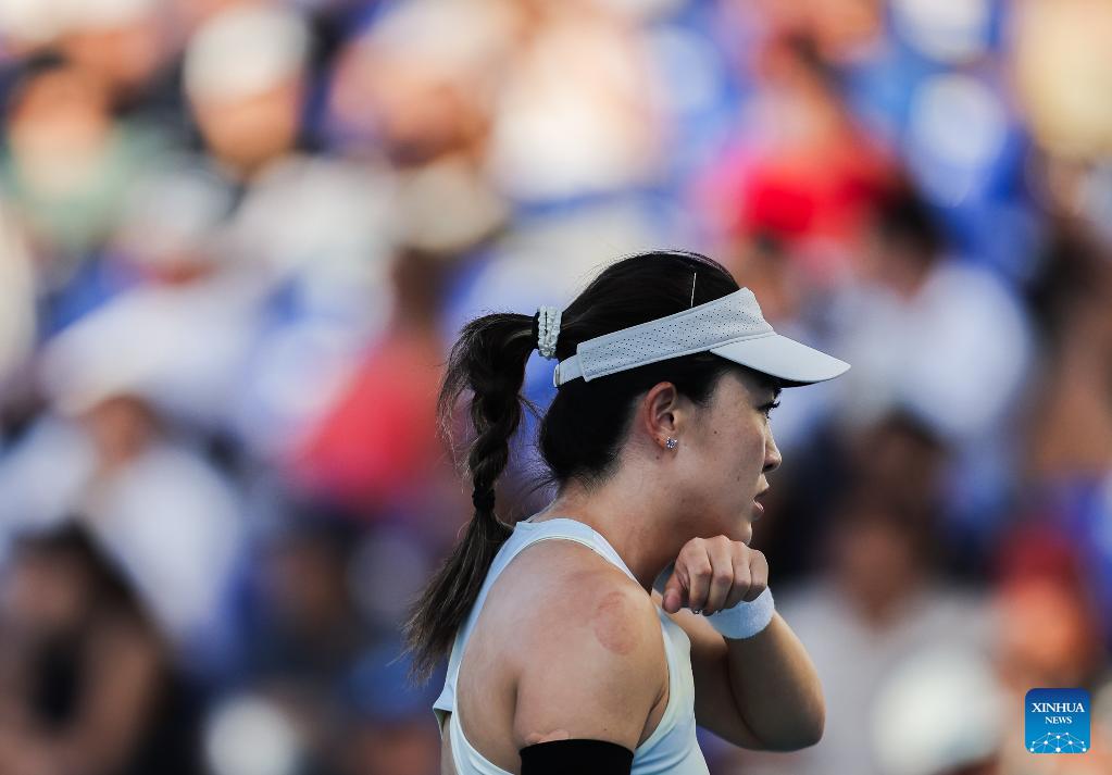 Zhu Lin reacts during the women's singles quarterfinal match between Donna Vekic of Croatia and Zhu Lin of China at the WTA Philippine Women's Open in Manila, the Philippines, Jan. 29, 2026. (Xinhua/Rouelle Umali)