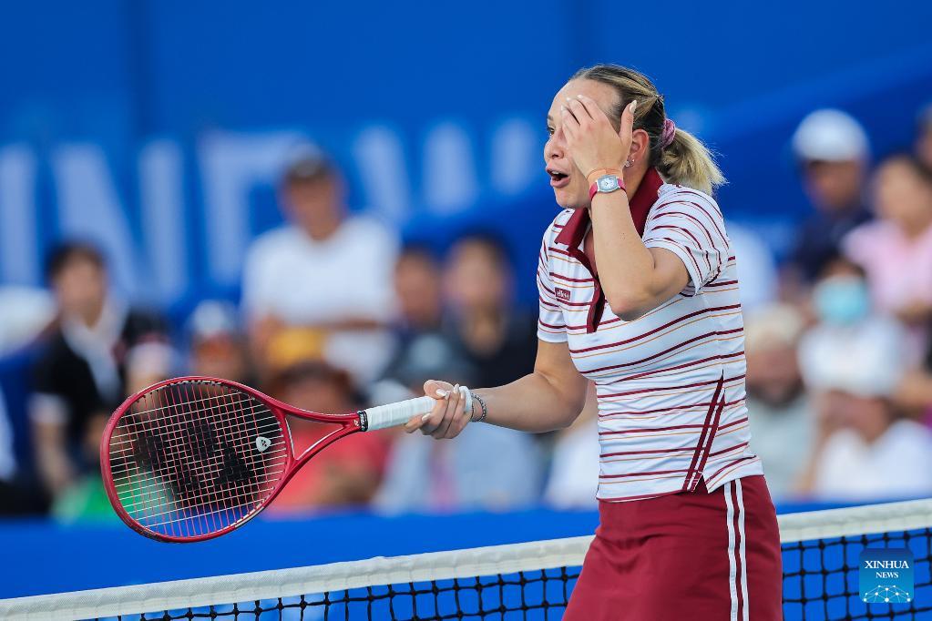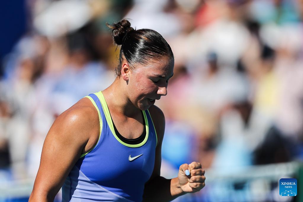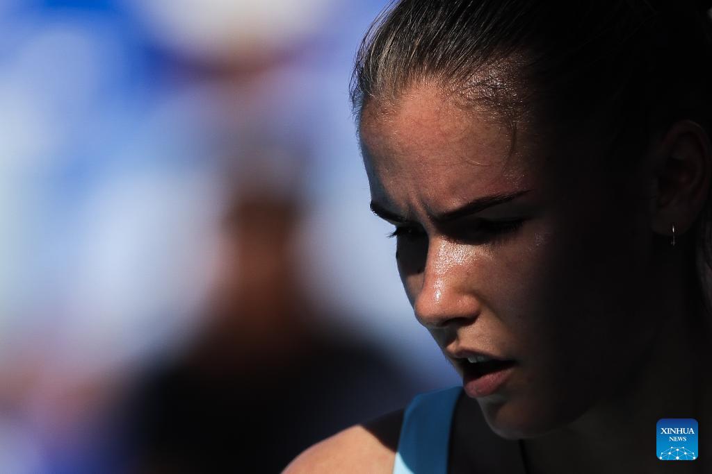 Donna Vekic reacts during the women's singles quarterfinal match between Donna Vekic of Croatia and Zhu Lin of China at the WTA Philippine Women's Open in Manila, the Philippines, Jan. 29, 2026. (Xinhua/Rouelle Umali)