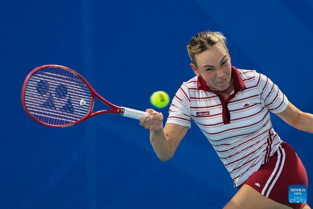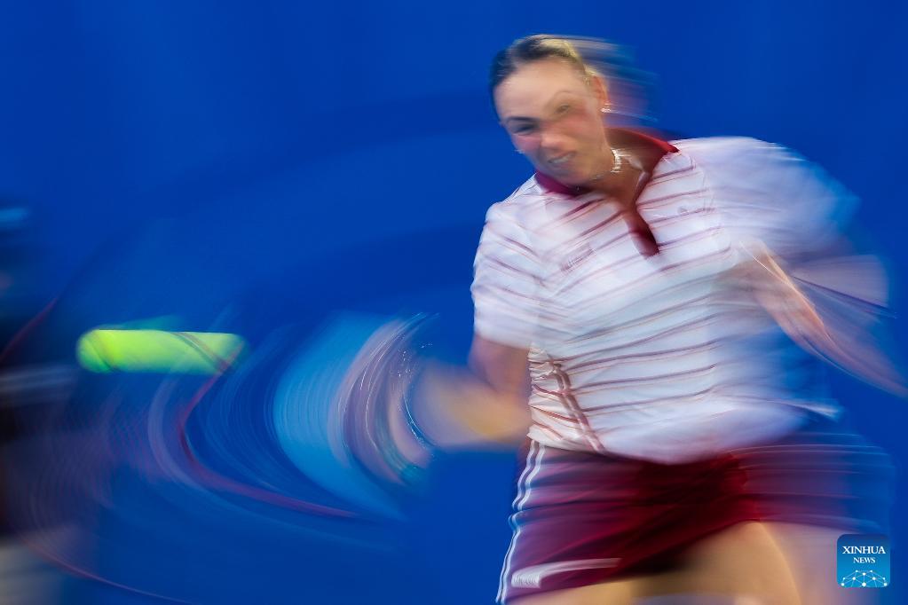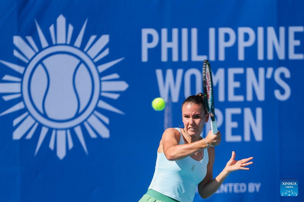 Sofia Costoulas hits a return during the women's singles quarterfinal match between Tatiana Prozorova of Russia and Sofia Costoulas of Belgium at the WTA Philippine Women's Open in Manila, the Philippines, Jan. 29, 2026. (Xinhua/Rouelle Umali)