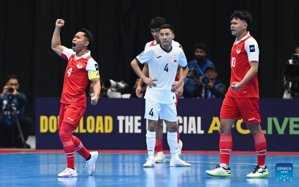 Mochammad Iqbal Rahmattulah (L) of Indonesia celebrates his goal during the group A match between Kyrgyz Republic and Indonesia at the AFC Futsal Asian Cup 2026 in Jakarta, Indonesia, Jan. 29, 2026. (Xinhua/Zulkarnain)