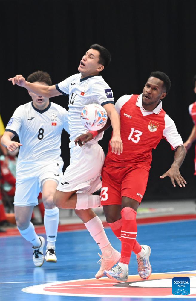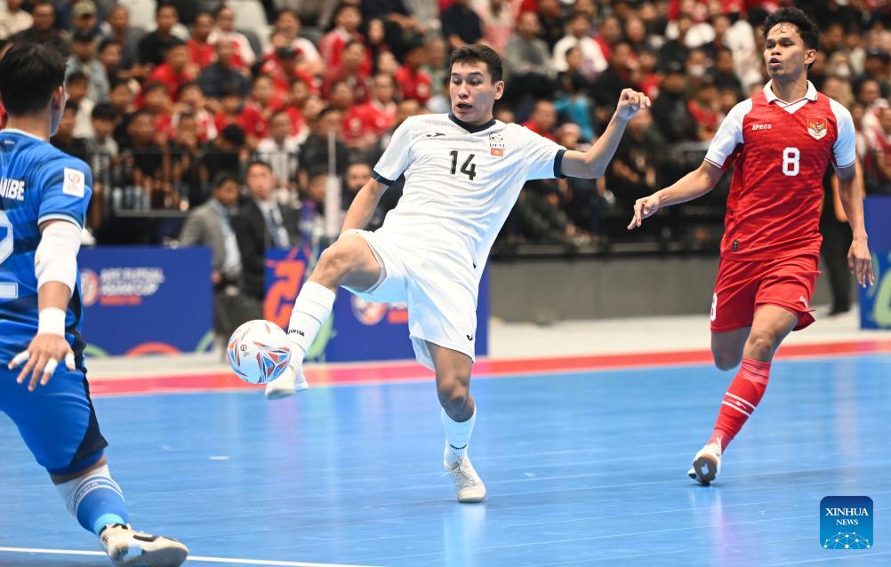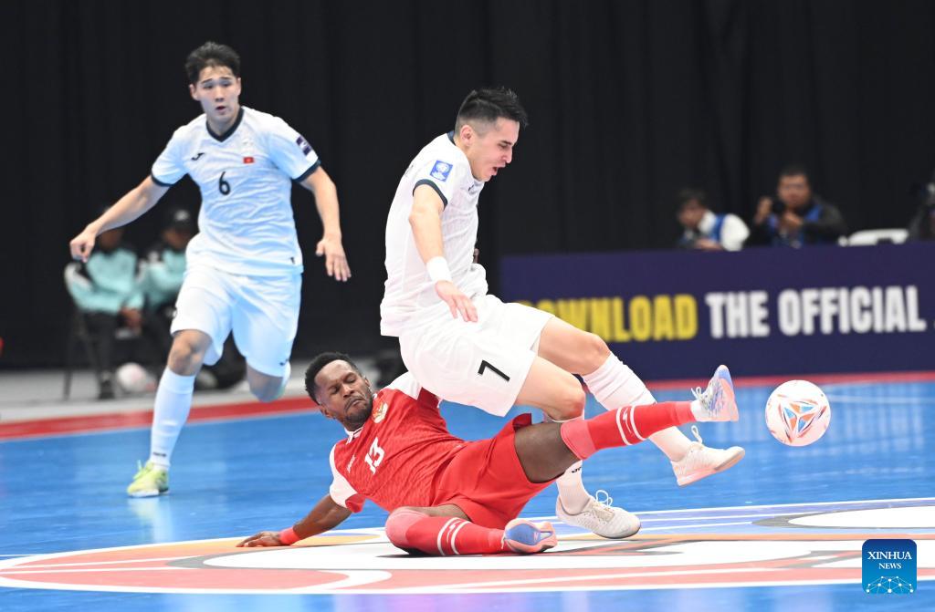 Samat Dzhanat Uulu (C) of Kyrgyz Republic vies with Wendy Brian Lindrey (R) of Indonesia during the group A match between Kyrgyz Republic and Indonesia at the AFC Futsal Asian Cup 2026 in Jakarta, Indonesia, Jan. 29, 2026. (Xinhua/Zulkarnain)