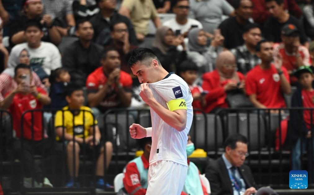 Shokhrukh Makhmadaminov of Kyrgyz Republic celerates his goal during the group A match between Kyrgyz Republic and Indonesia at the AFC Futsal Asian Cup 2026 in Jakarta, Indonesia, Jan. 29, 2026. (Xinhua/Zulkarnain)