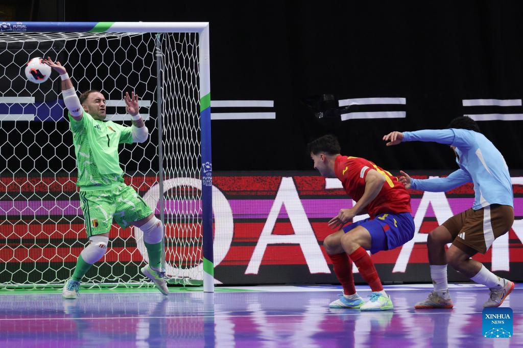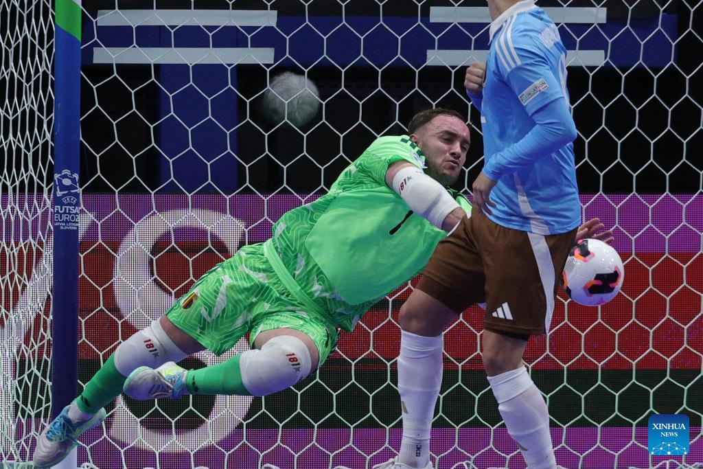 Goalkeeper Dries Vrancken (L) of Belgium blocks during the UEFA Futsal EURO 2026 group match between Spain and Belgium at Arena Stozice, Ljubljana, Slovenia, Jan. 29, 2026. (Photo by Zeljko Stevanic/Xinhua)