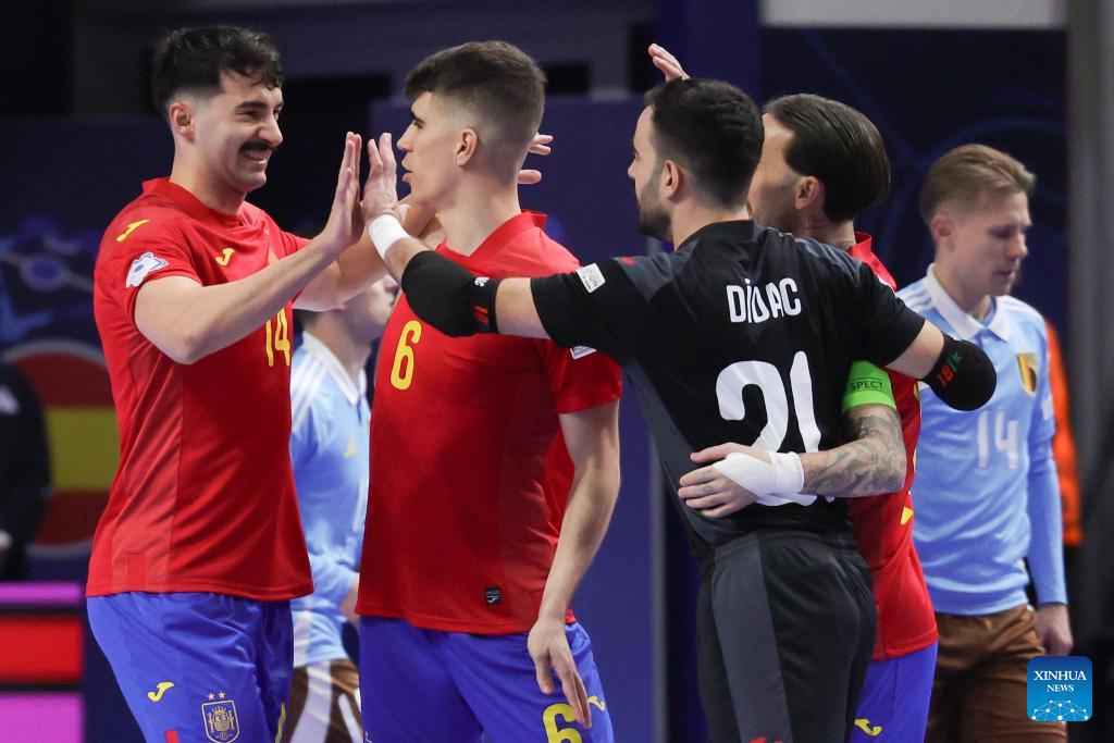 Players of Spain celebrate a goal during the UEFA Futsal EURO 2026 group match between Spain and Belgium at Arena Stozice, Ljubljana, Slovenia, Jan. 29, 2026. (Photo by Zeljko Stevanic/Xinhua)