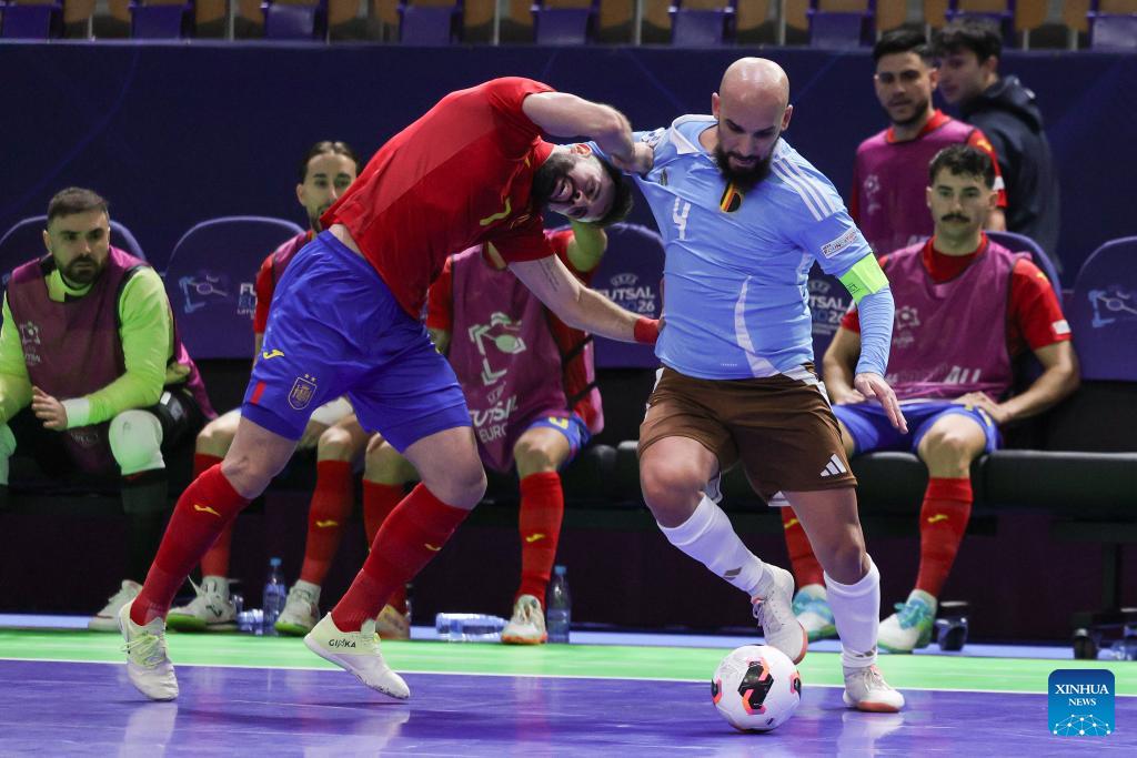Jose Raya (L) of Spain vies with Omar Rahou (R) of Belgium during the UEFA Futsal EURO 2026 group match between Spain and Belgium at Arena Stozice, Ljubljana, Slovenia, Jan. 29, 2026. (Photo by Zeljko Stevanic/Xinhua)
