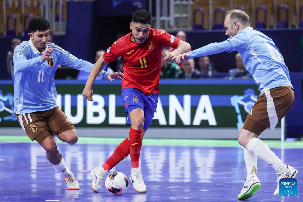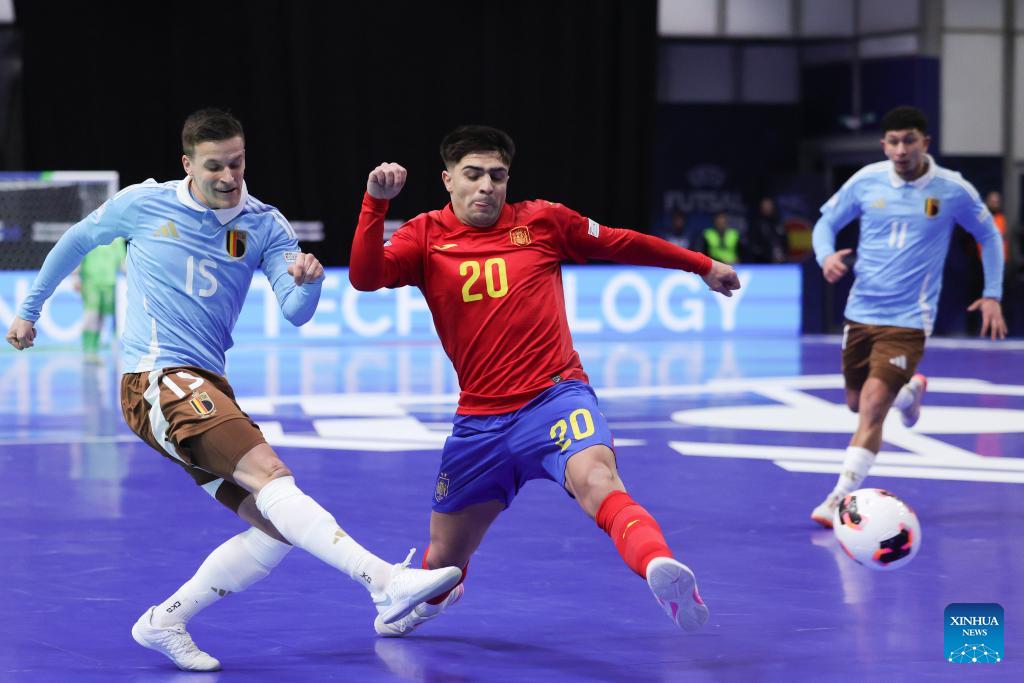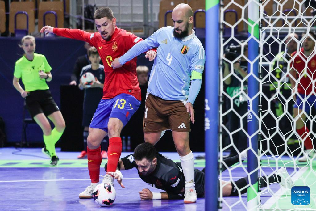 Francisco Cortes (C) of Spain competes during the UEFA Futsal EURO 2026 group match between Spain and Belgium at Arena Stozice, Ljubljana, Slovenia, Jan. 29, 2026. (Photo by Zeljko Stevanic/Xinhua)