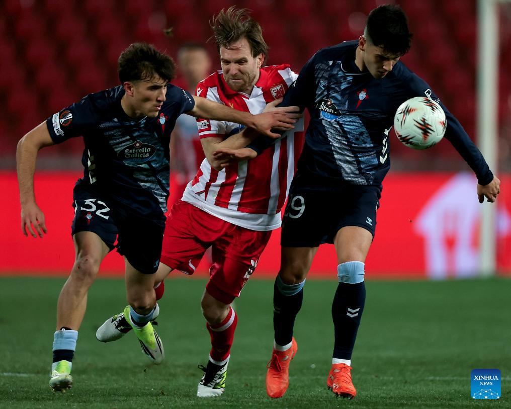 Crvena Zvezda's Aleksandar Katai (C) vies with Celta Vigo's Javi Rodriguez (L) and Yoel Lago during the UEFA Europa League football match between Crvena Zvezda and Celta Vigo in Belgrade, Serbia, on Jan. 29, 2026. (Photo by Predrag Milosavljevic/Xinhua)