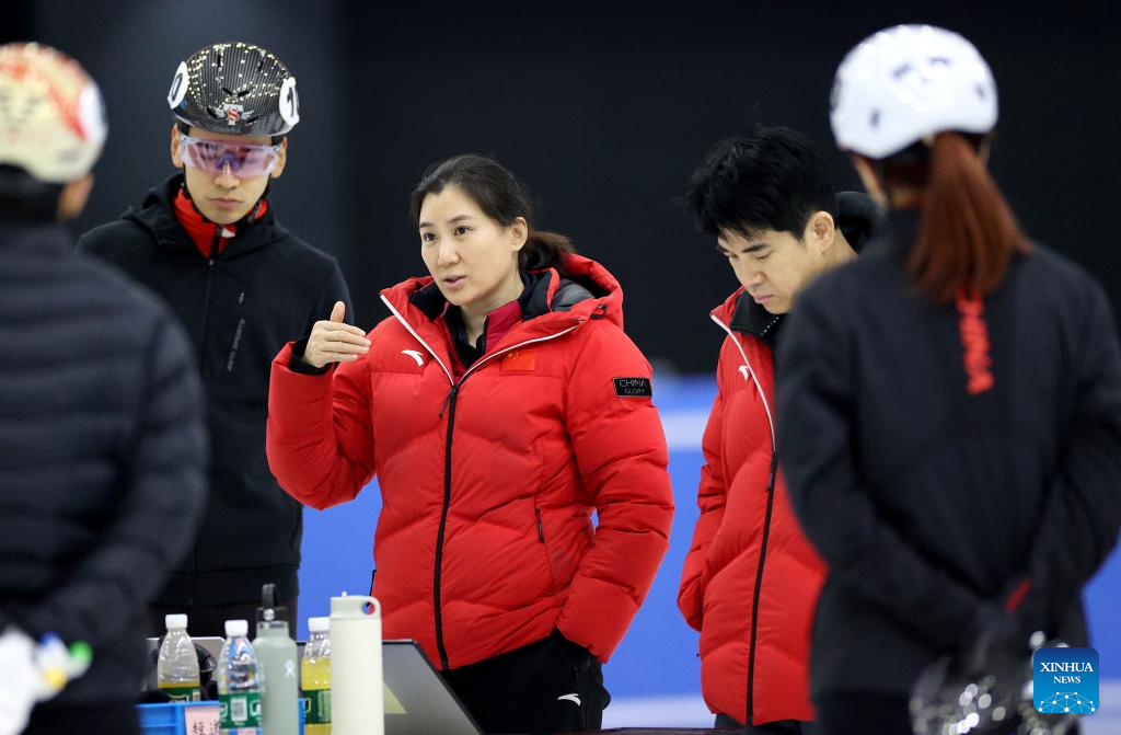 Zhang Jing (C), head coach of China's short track speed skating team, speaks during a training session ahead of the upcoming Milan-Cortina 2026 Winter Olympics in Beijing, China, Jan. 29, 2026. (Xinhua/Zhang Chen)