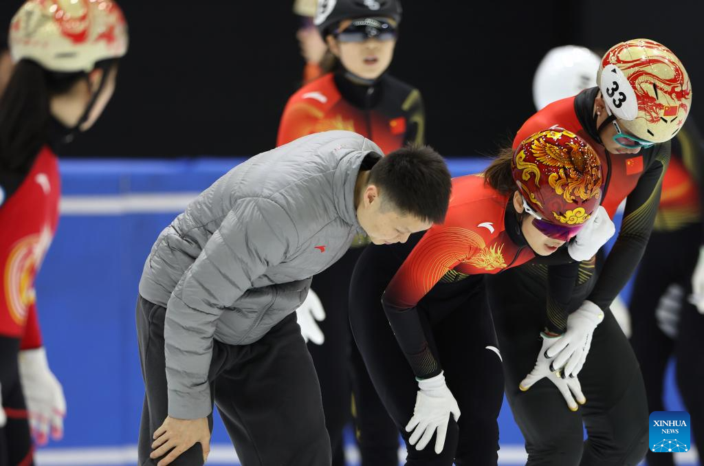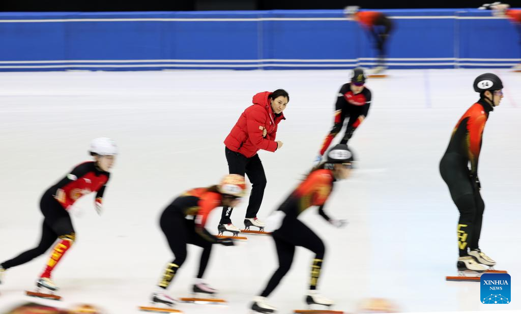 Zhang Jing (C), head coach of China's short track speed skating team, instructs skaters during a training session ahead of the upcoming Milan-Cortina 2026 Winter Olympics in Beijing, China, Jan. 29, 2026. (Xinhua/Zhang Chen)